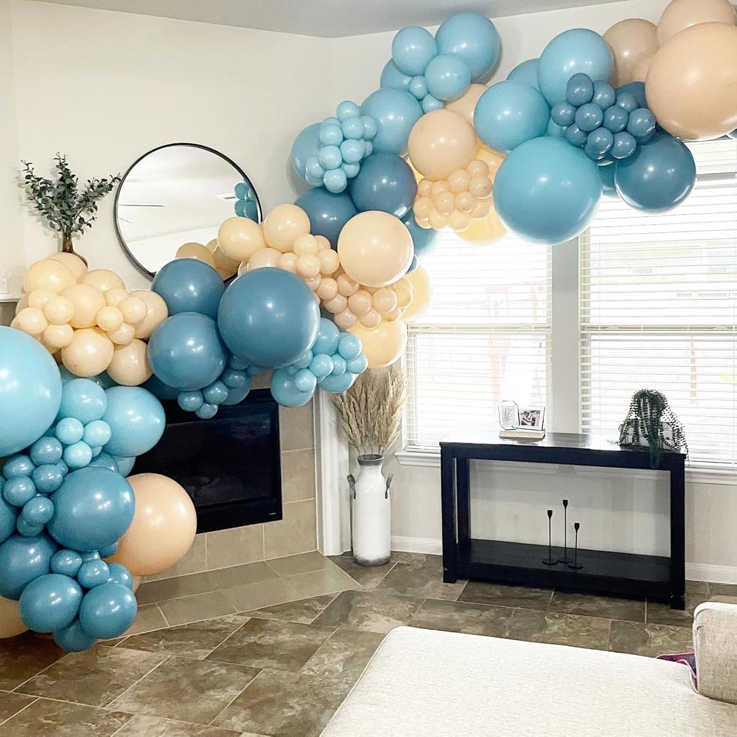 - 12 inch Dusty Blue Balloons: 52 Pcs dusty blue balloons set including 10* dusty dark blue balloons, 10* dusty blue balloons, 10* metallic quicksand gold balloons, 10* sand white balloons, 10* matte light blue balloons, 2* white ribbons. Whether it’s a baby shower, birthday party, or any theme celebration, these balloons will bring a unique visual appeal to your venue