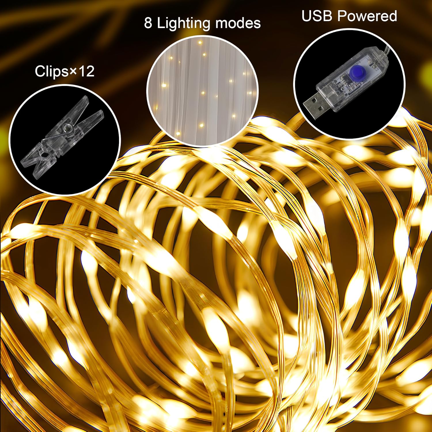 - Included Components : 10ft Warm White String Light (1 set), 90 Transparent Clips