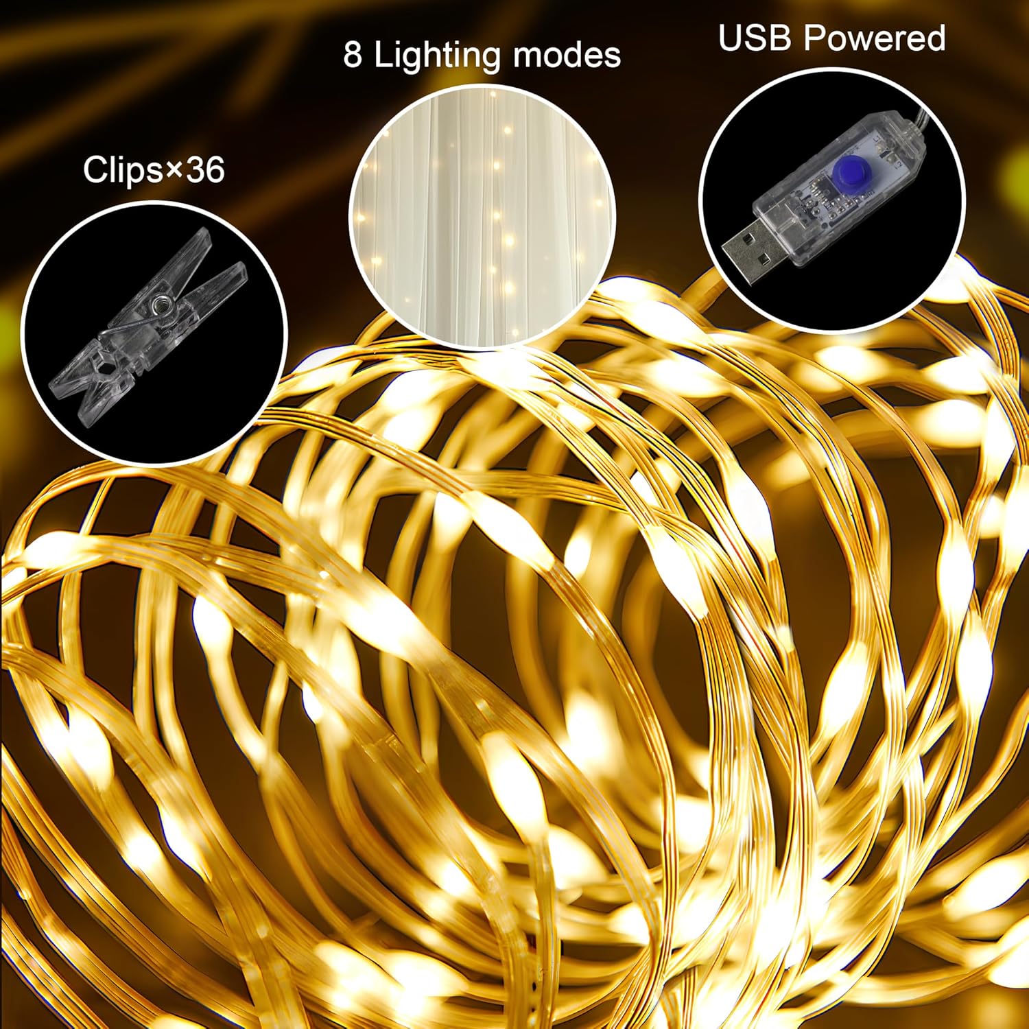 - Package Includes: The package includes 6 panels soft white curtain with lights, each panel tulle backdrop curtain size is 5FT width and 8FT height, a set of 10ft warm white string light (USB Powered) and 12pcs Transparent clips.