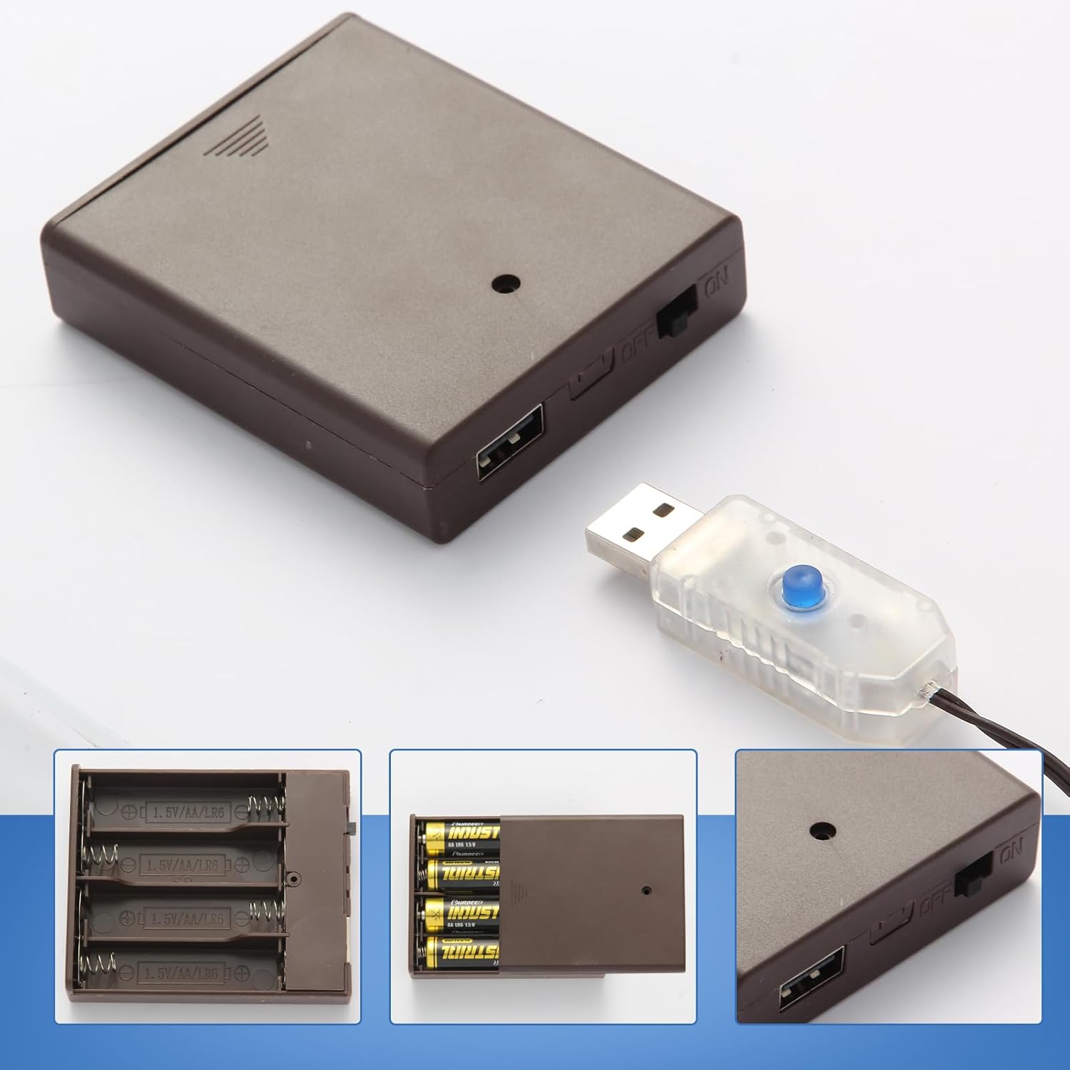 - 🎄【SAFE USB POWER SUPPLY】:1Pcs 4 AA batteries holder 6V with USB female socket and On/Off switch(Batteries Included),Also you can connect it with power bank, USB adapter, TV, phone charger and any others with USB port.
