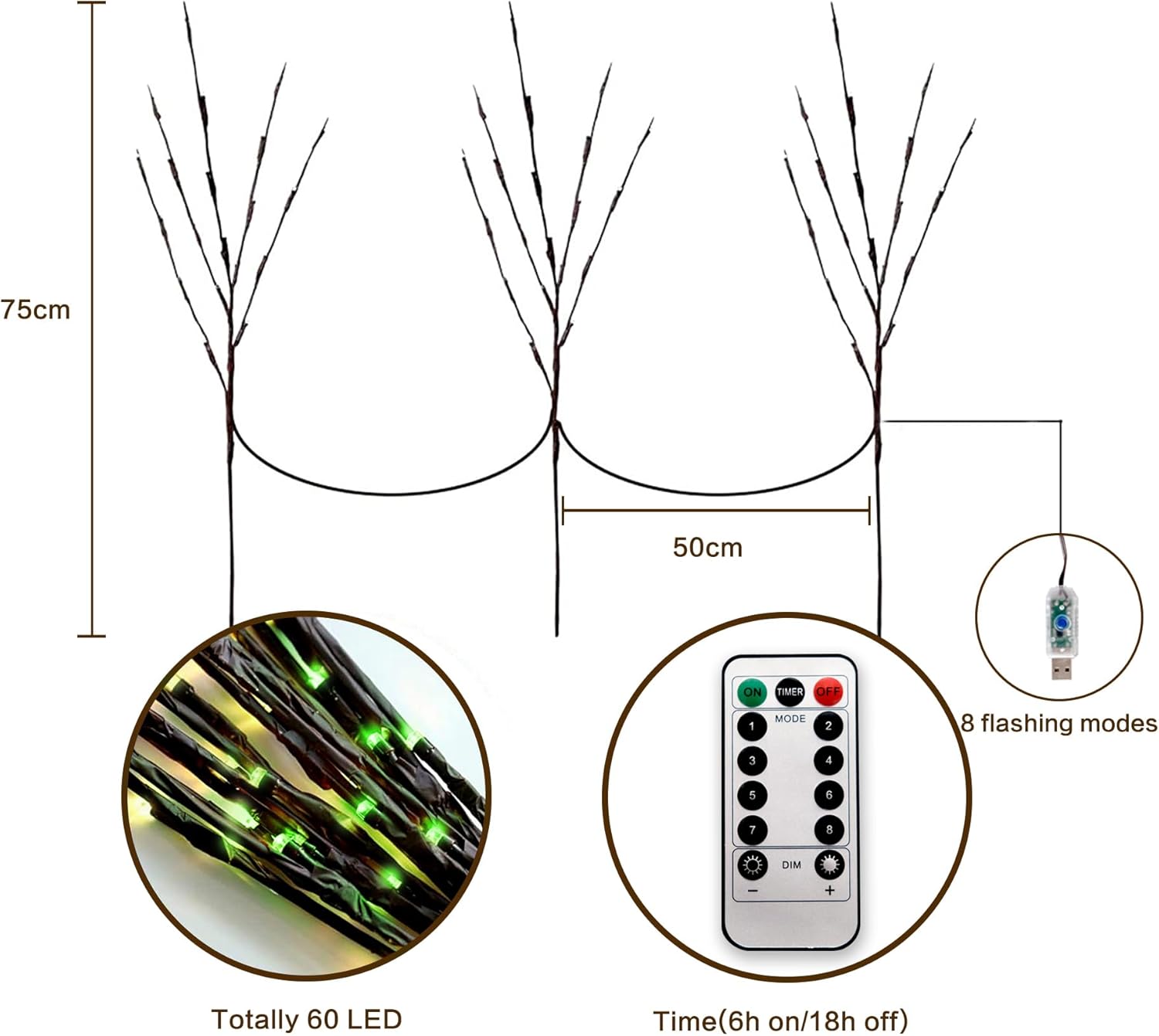 - 🎄【TWIG TREE LIGHT】3pcs branches are included,Each willow branch light comes with 5 bendable stems, 30 inches tall, 60 LED green color light bulbs are enough to create a relaxed and warm atmosphere.