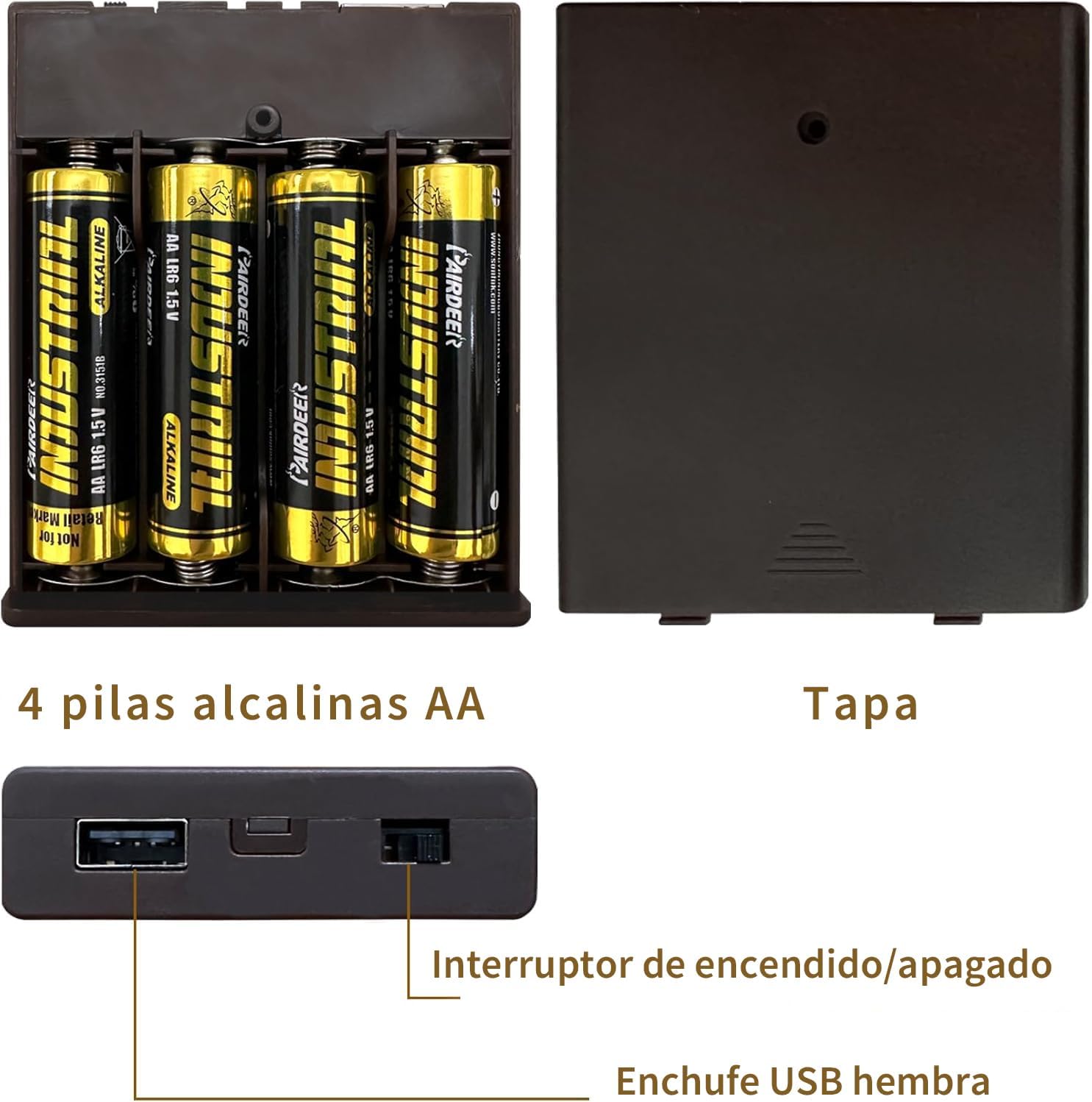 - đăSAFE USB POWER SUPPLYă:1Pcs 4 AA batteries holder 6V with USB female socket and On/Off switch(Batteries Included),Also you can connect it with power bank, USB adapter, TV, phone charger and any others with USB port.