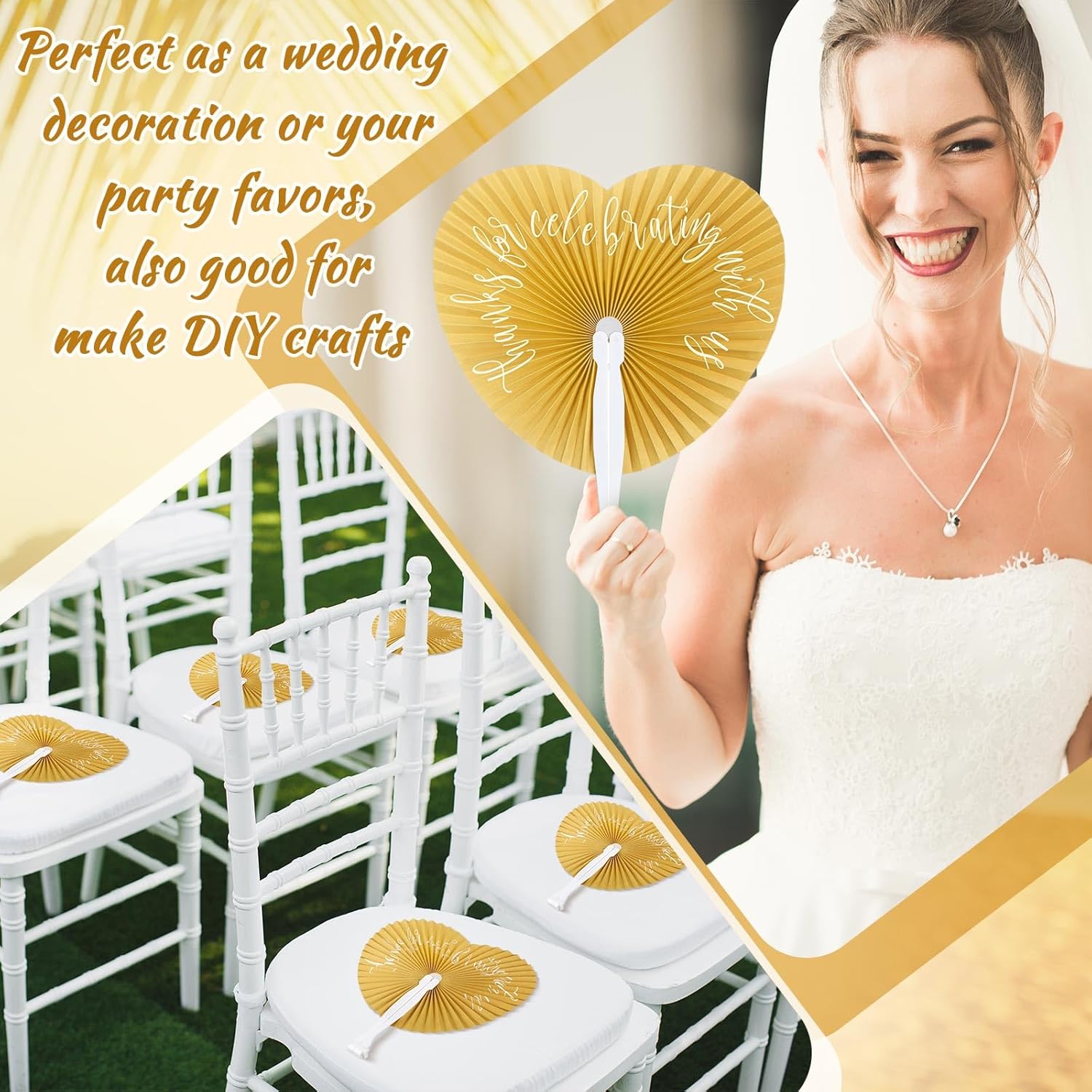 - Generous Pack of 120: our package includes 120 pieces of wedding gold folding fans, each elegantly printed with the heartwarming message 'Thanks for Celebrating with US' and comes with a gift bag; Wedding fans are suitable for distributing among guests at wedding parties, bridal showers, or summer parties, adding a sweet atmosphere to your special events