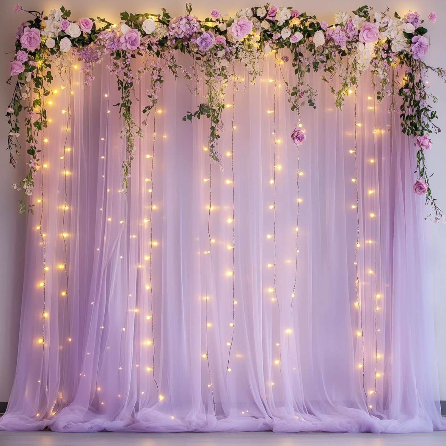 - Package Includes: The package includes 2 panels soft lavender curtain with lights, each panel tulle backdrop curtain size is 5FT width and 10FT height, a set of 10ft warm white string light (USB Powered) and 12pcs Transparent clips.