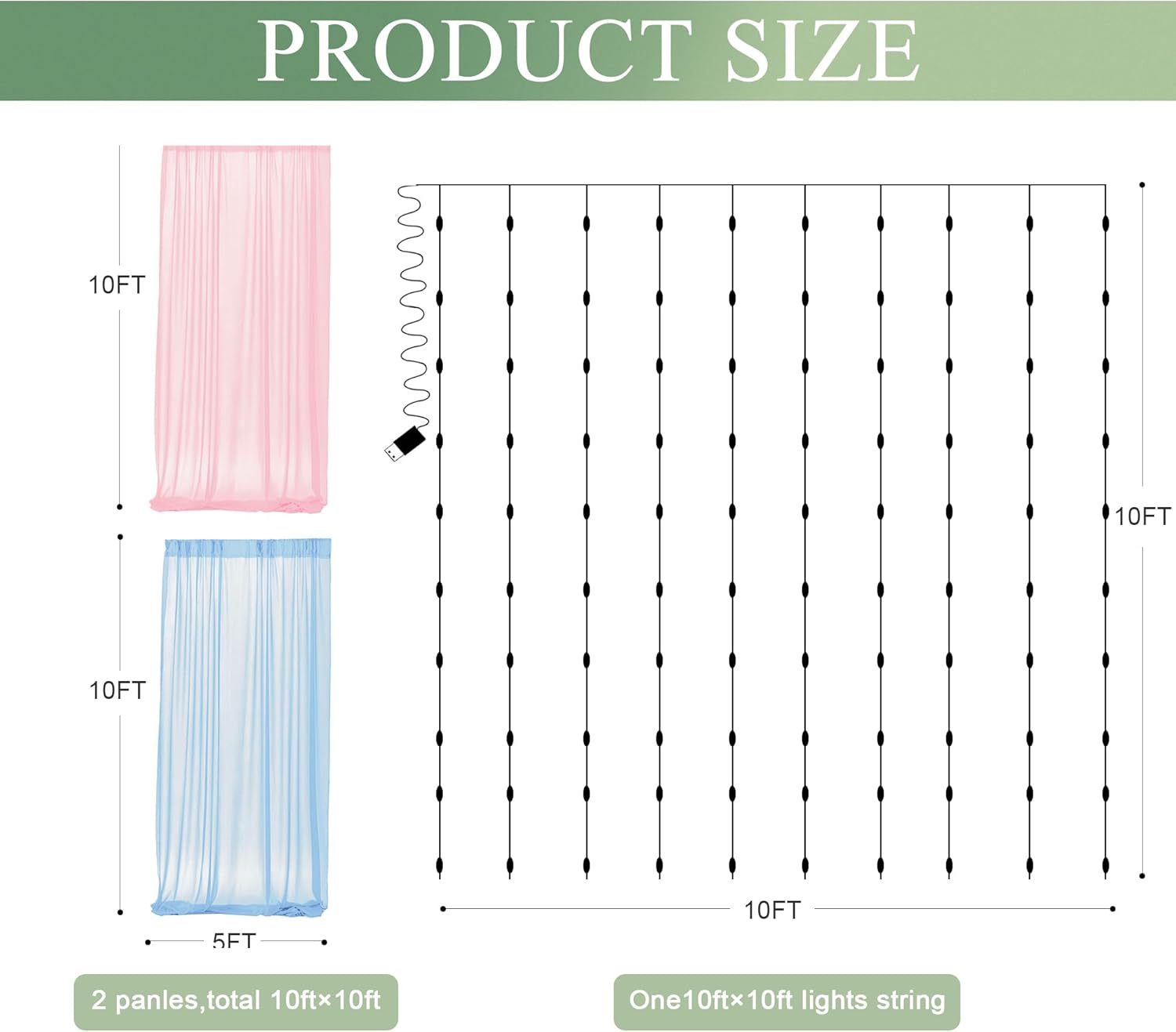 - Package Includes: The package includes 2 panels soft pink and blue curtain with lights, each panel tulle backdrop curtain size is 5FT width and 10FT height, a set of 10ft warm white string light (USB Powered) and 12pcs Transparent clips.