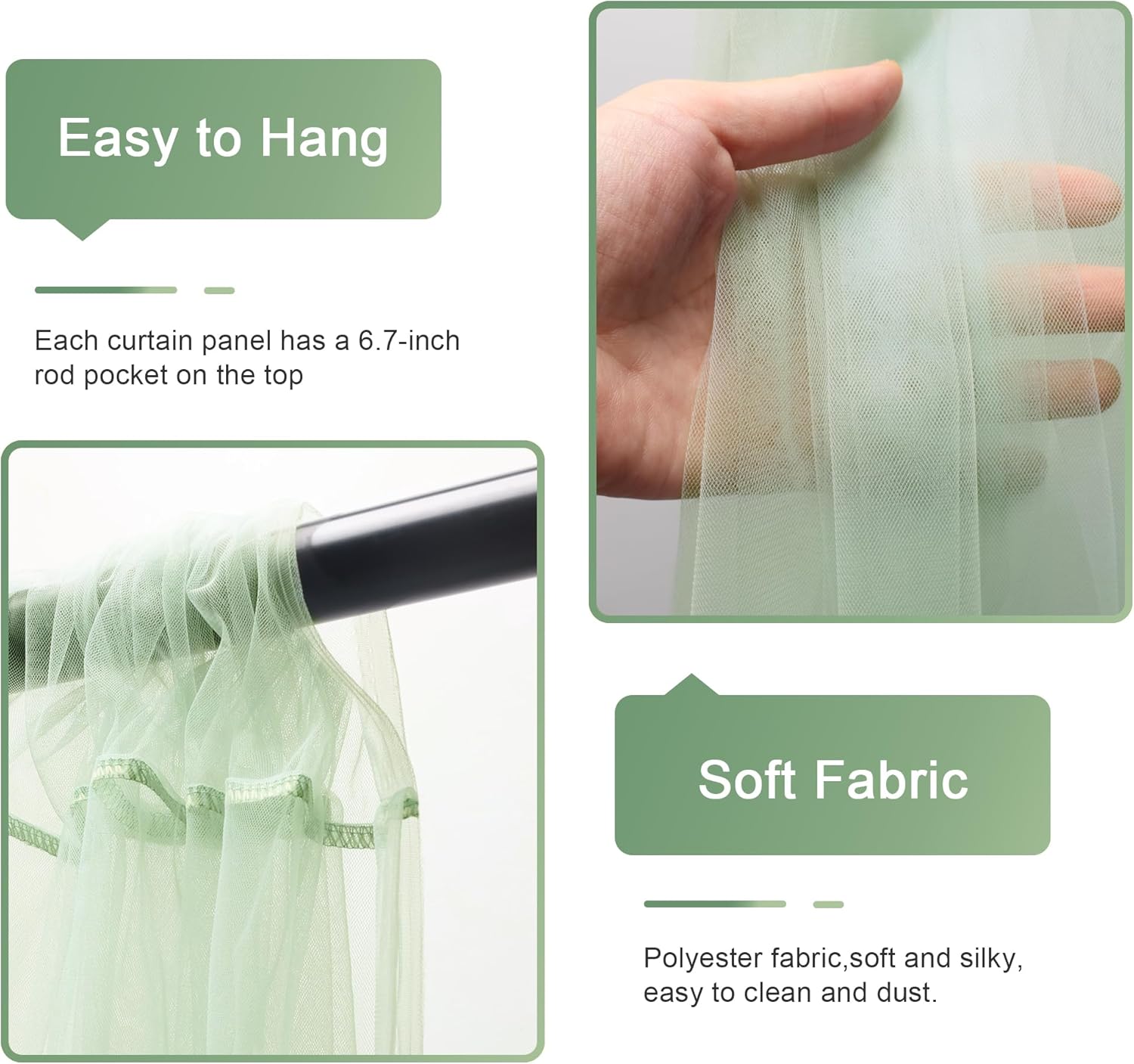 - Package Includes: The package includes 2 panels soft sage green curtain with lights, each panel tulle backdrop curtain size is 5FT width and 10FT height, a set of 10ft warm white string light (USB Powered) and 12pcs Transparent clips.