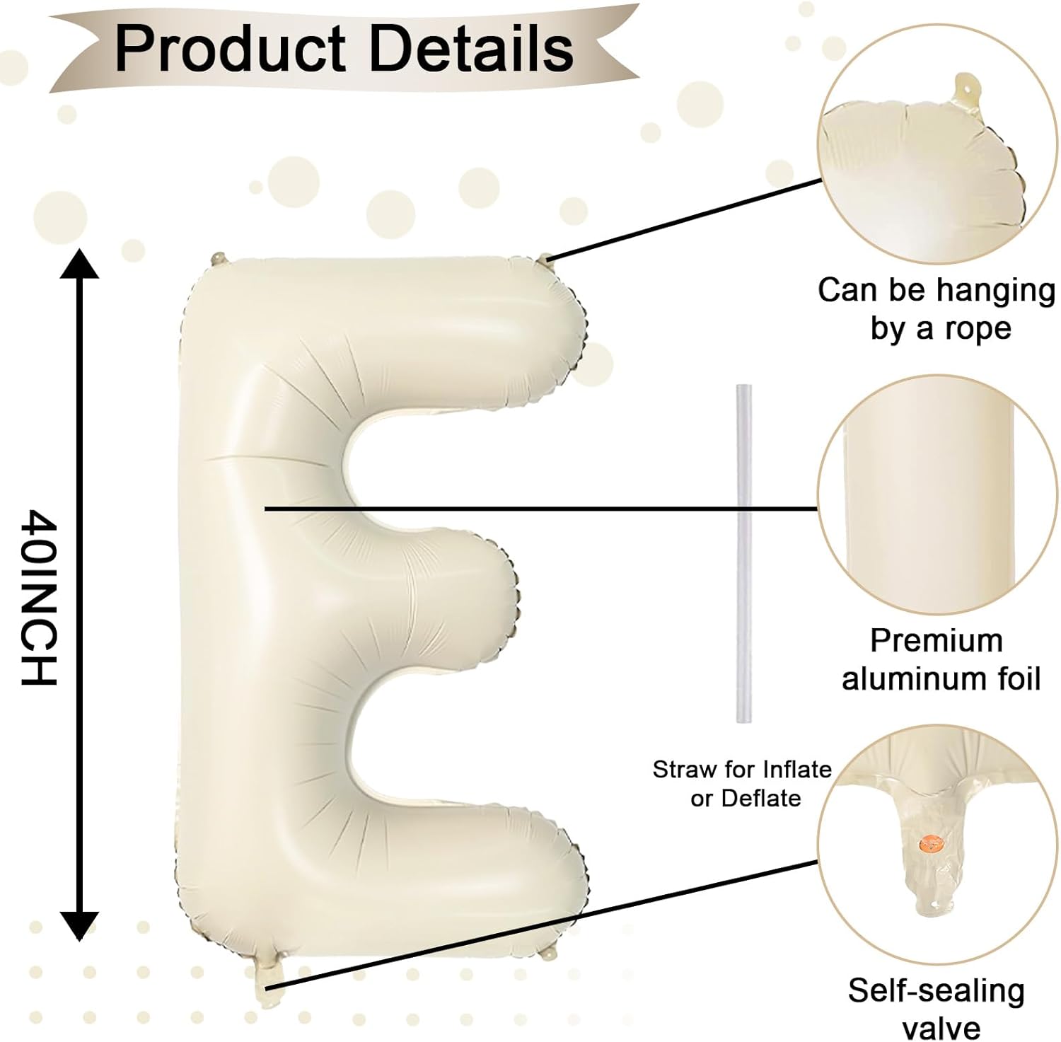 - Cream White Letter E Balloon 40 Inch: Includes 1pc giant beige "E" letter balloon and 1 straw for easy inflation and deflation. Our elegant big beige balloons are perfect for personalized parties. With 26 letters (A-Z) and numbers (1-9) available, you can mix and match to fit your theme.