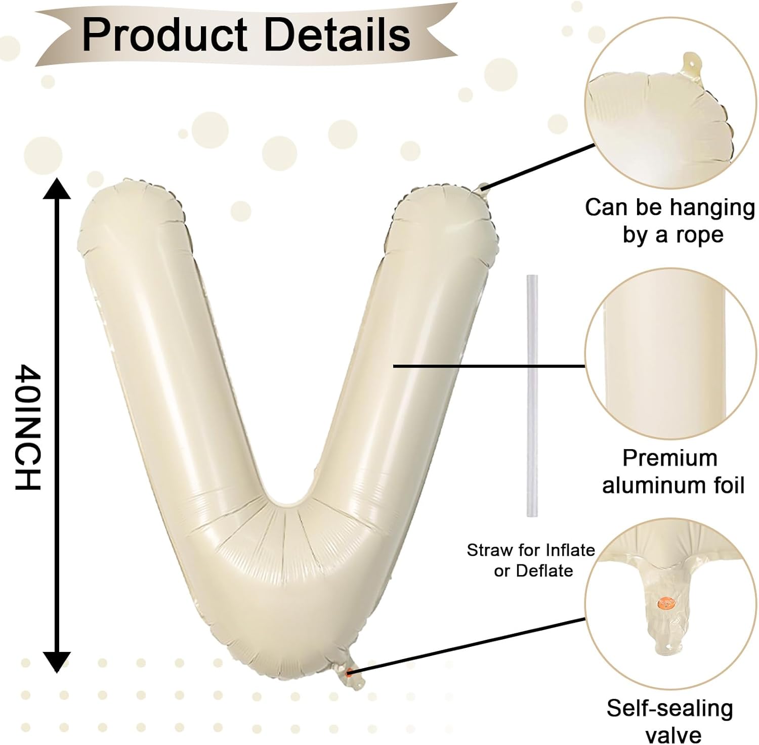 - Cream White Letter V Balloon 40 Inch: Includes 1pc giant beige "V" letter balloon and 1 straw for easy inflation and deflation. Our elegant big beige balloons are perfect for personalized parties. With 26 letters (A-Z) and numbers (1-9) available, you can mix and match to fit your theme.