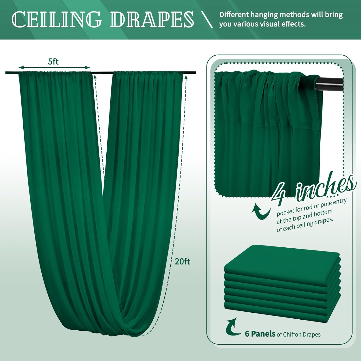 6 Panels Emerald Green Ceiling Drapes for Wedding 5ftx20ft Chiffon Fabric Arch Draping Curtains Sheer Drapery for Party Ceremony Birthday Baby Shower Reception Stage Swag Ceiling Decorations