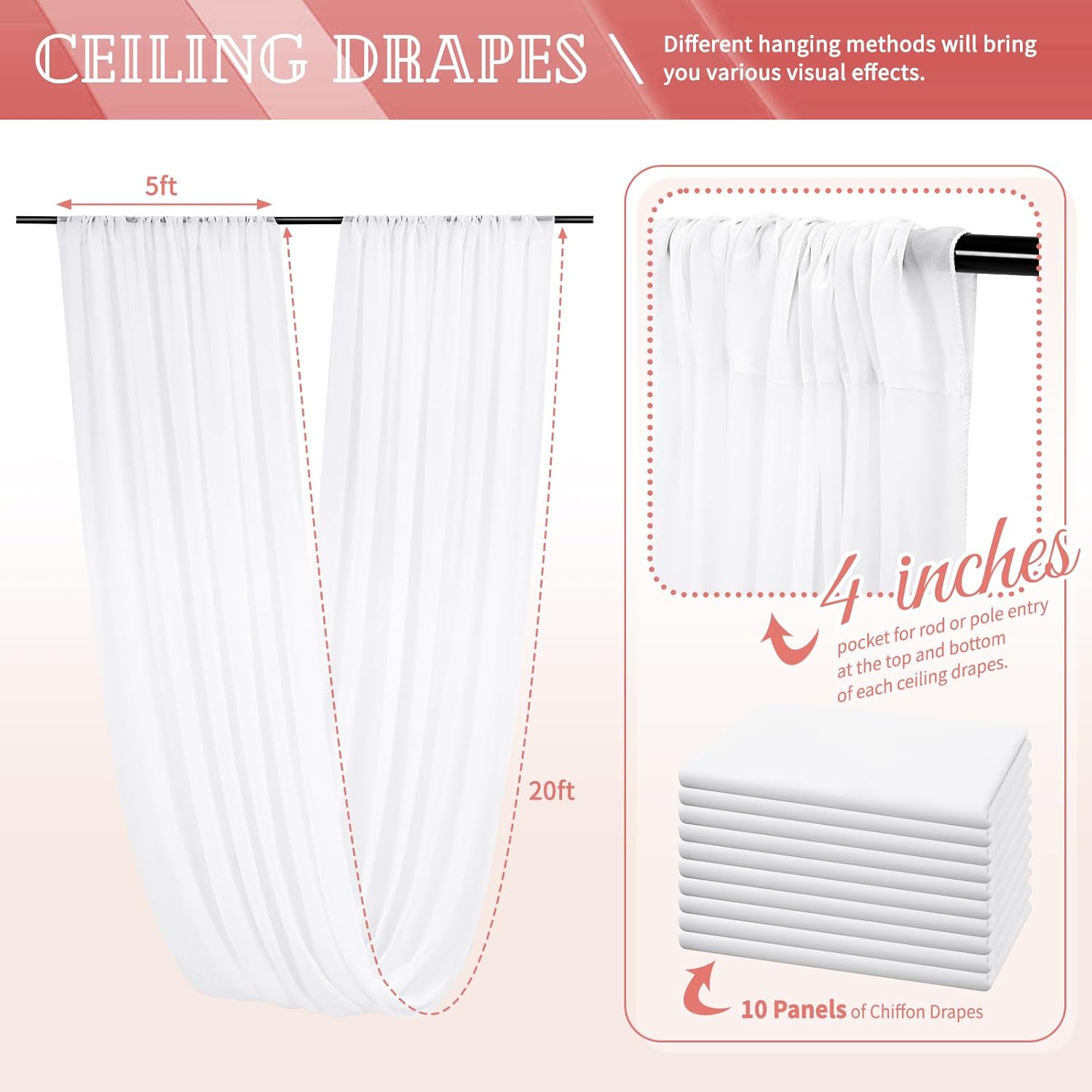 - 【Soft Sheer Material】Long wedding drapes is made of soft touch chiffon fabric. All edges are finished with firm and exquisite stitching, airy and light-weighted. Wrinkle-free, easy draping or hanging straight, good vertical sense and durable. These backdrop curtains will help to create a great eye catching detail in your wedding ceiling decoration.