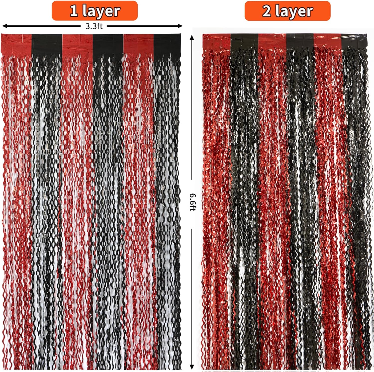 - Package Contents: 4 pack laser red black wavy foil fringe curtains,each curtain is 3.3ft x6.6ft,You can cut the metallic backdrop into the suitable length for use,Wonderful accessories for decorating doors and walls