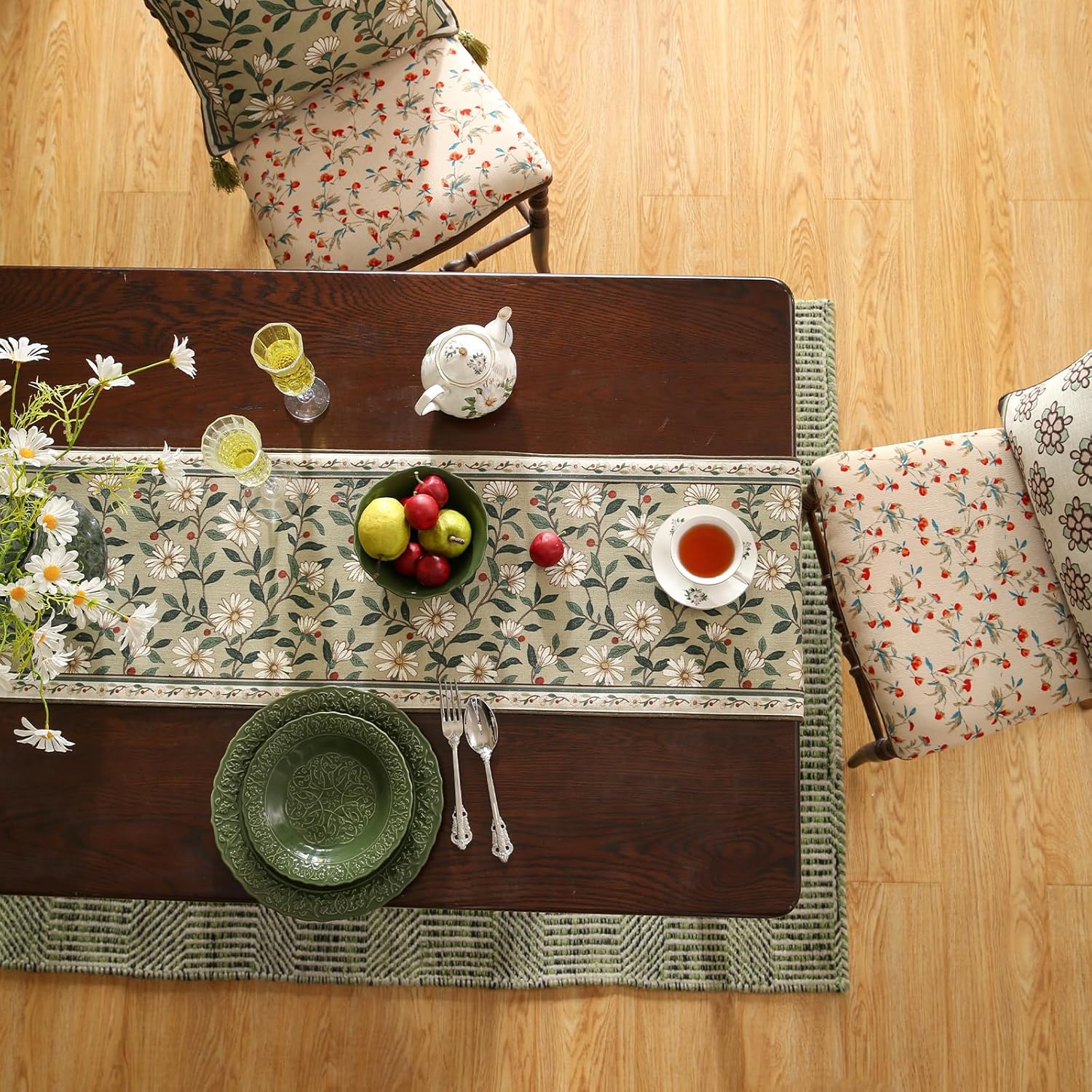 - Unique Design:Each table runner features patterns hand-drawn by our designers,showcasing exquisite details and rich textures for stunning visual appeal.The meticulous stitching ensures a smooth,wrinkle-resistant,and durable finish.With its fresh,rustic yet elegant style,it adds vibrancy and charm to your home decor