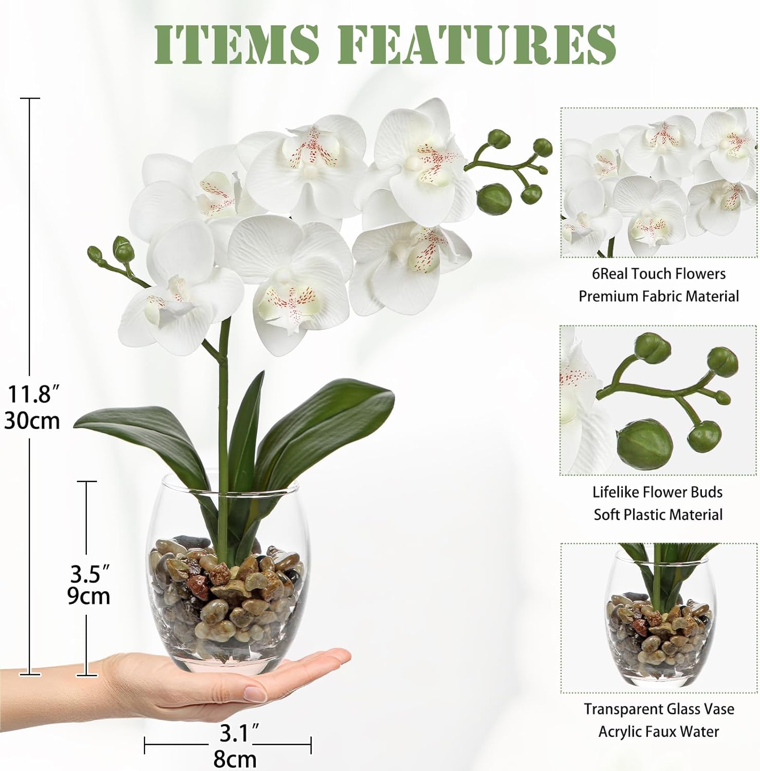 - Artificial Orchids with Vase - This white orchids for centerpieces has 6 eye-catching bloomed white orchid flowers, with lifelike orchid branche, leaves and buds, its stems are covered in nature stone and faux water, are displayed in a clear glass vase perfectly, it enhance the taste of home decoration.This white orchids arrangements is an ideal gift for your lovers/family/friends on Mother's Day, Anniversary, Housewarmings, Birthday (the orchid branches cannot be takend out)
