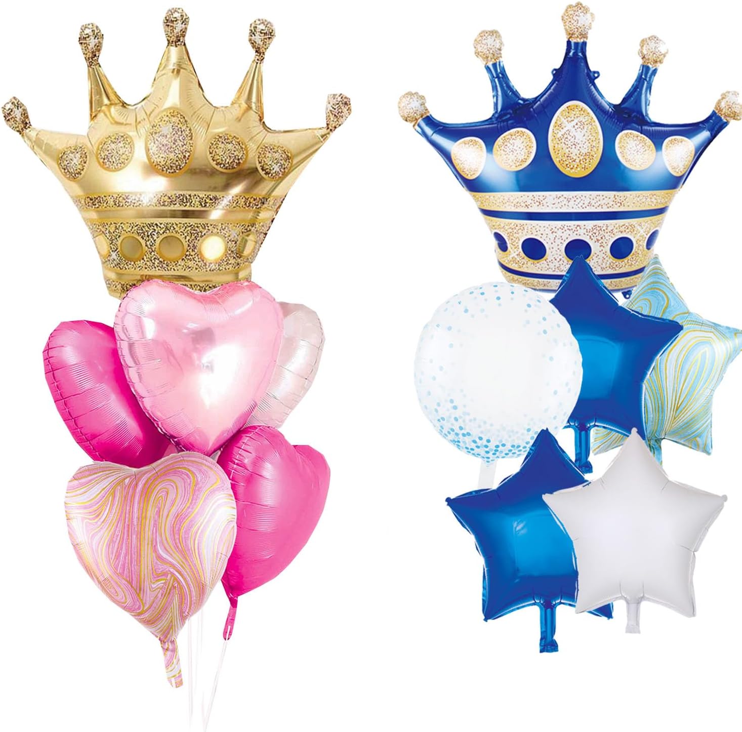 - Festive Balloons Set: This set includes 2 large crown balloons, 5 heart-shaped balloons (2 hot pink, 1 pink, 1 marbled pink and one white), 4 various star foil balloons and one blue dot clear foil balloon.Perfect for birthdays, gender reveal party decorations,boy or girl baby shower decor,pink and blue balloons party, or princess parties.