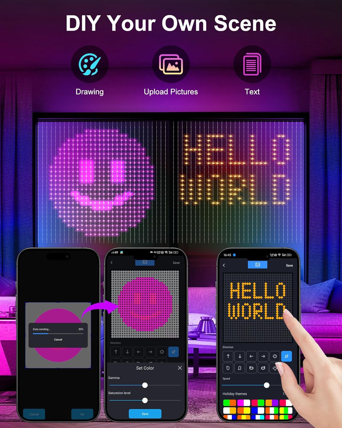 - DIY Pattern and Text Input: Enjoy the FUN of hands on creation, add or map your desired pattern and input the phrases or letter, change its color, speed, or moving direction to display your works. What's more, you can also upload any pictures you like and display them on the curtain lights! Really fantastic as an animated curtain lights for backdrop or light wall!