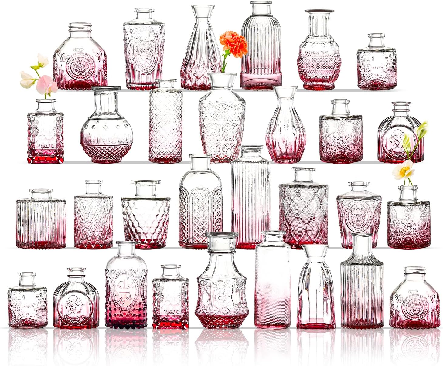 Bud Vases in Bulk 30, Pink Glass Vases for Centerpieces, Small Vase for Flowers, Small Flower Vase for Centerpieces, Mini Vintage Vases for Wedding Table Decor