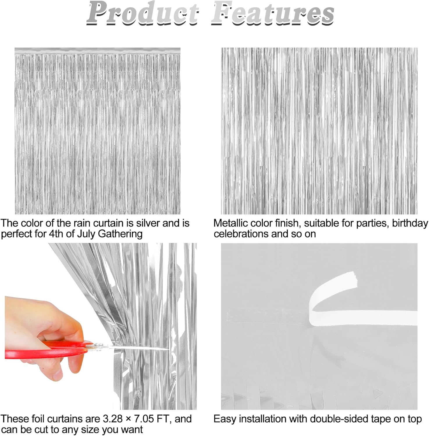 - Use Occasions: Suitable for a variety of celebrations including Independence Day, parties, birthdays, and other festive events, these silver foil curtains are perfect for adding a glamorous touch to any occasion.