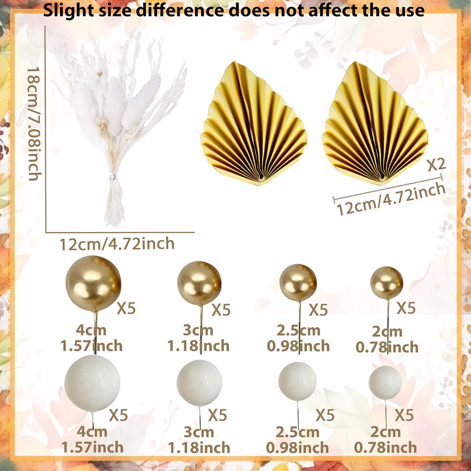 - You will get: 1 bunch rabbit tail grass,2 x gold palm leaves, 20 x gold cake balls, 20 x white cake balls. Size as picture shows