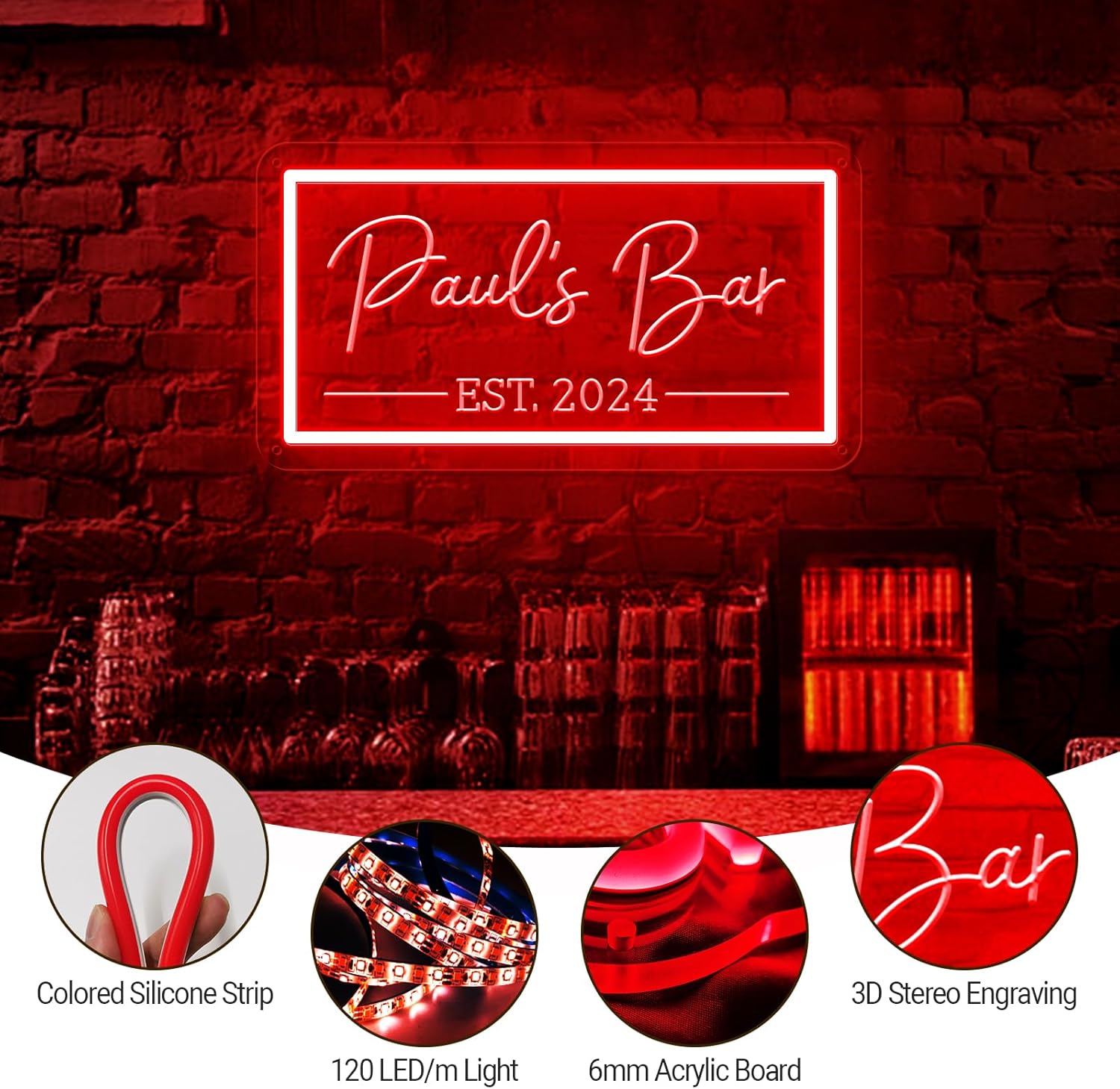 - 【3D Engraving Process】Our personalized bar neon signs feature a upgraded 3D engraving process, where custom text and graphics are etched onto a clear acrylic board. The stereo carvings are colorless and illuminated by vibrant colored LED neon strips that bring out the best 3D lighting, adding depth and brightness to turn any wall into a personalized artwork.