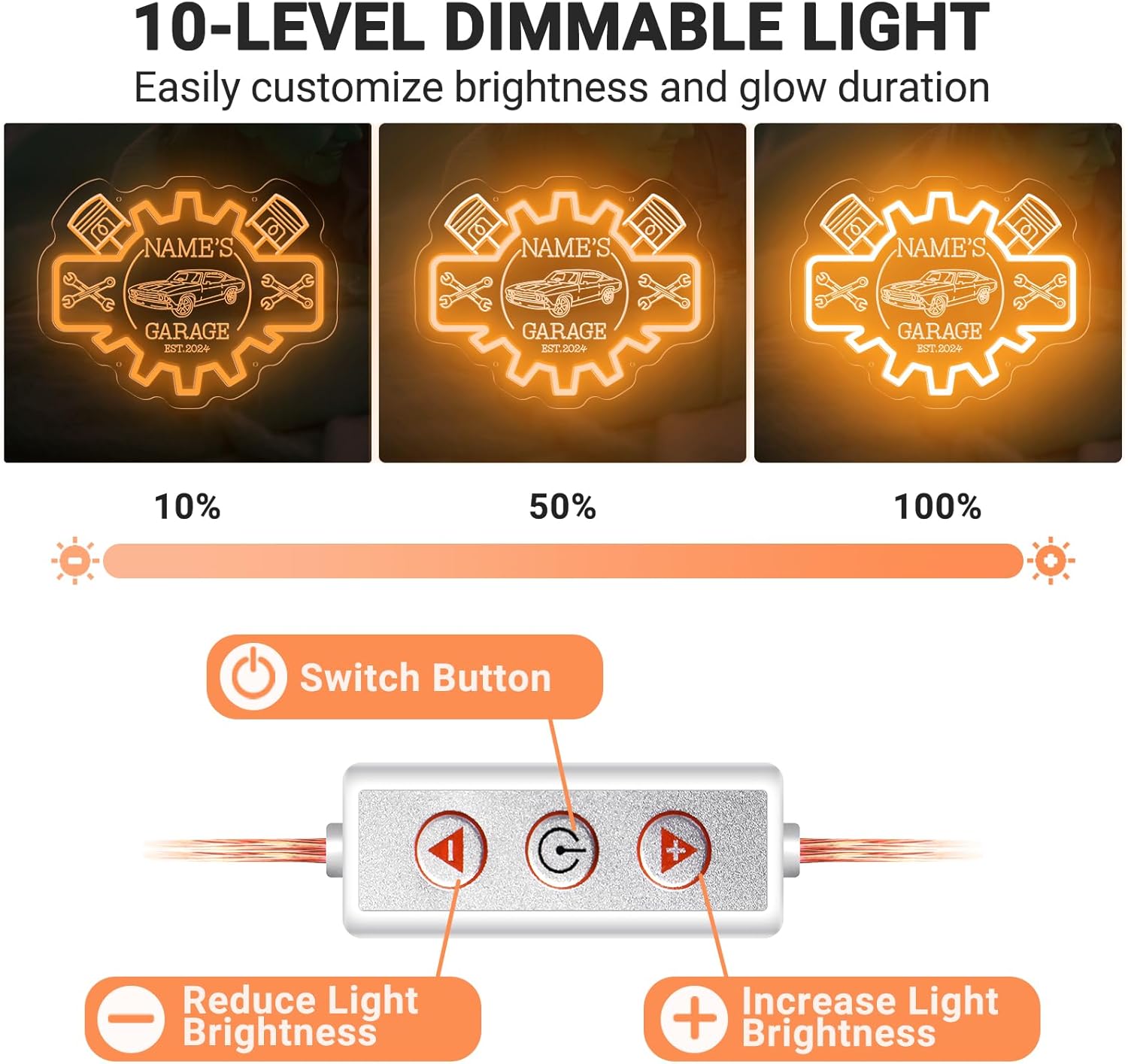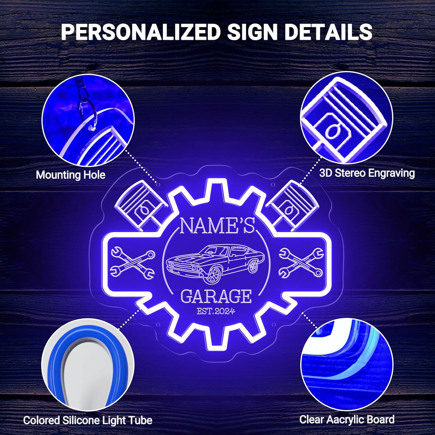 - 【3D Engraving Process】Our personalized garage neon signs feature a upgraded 3D engraving process, where custom text and graphics are etched onto a clear acrylic board. The stereo carvings are colorless and illuminated by vibrant colored LED neon strips that bring out the best 3D lighting, adding depth and brightness to turn any wall into a personalized artwork.