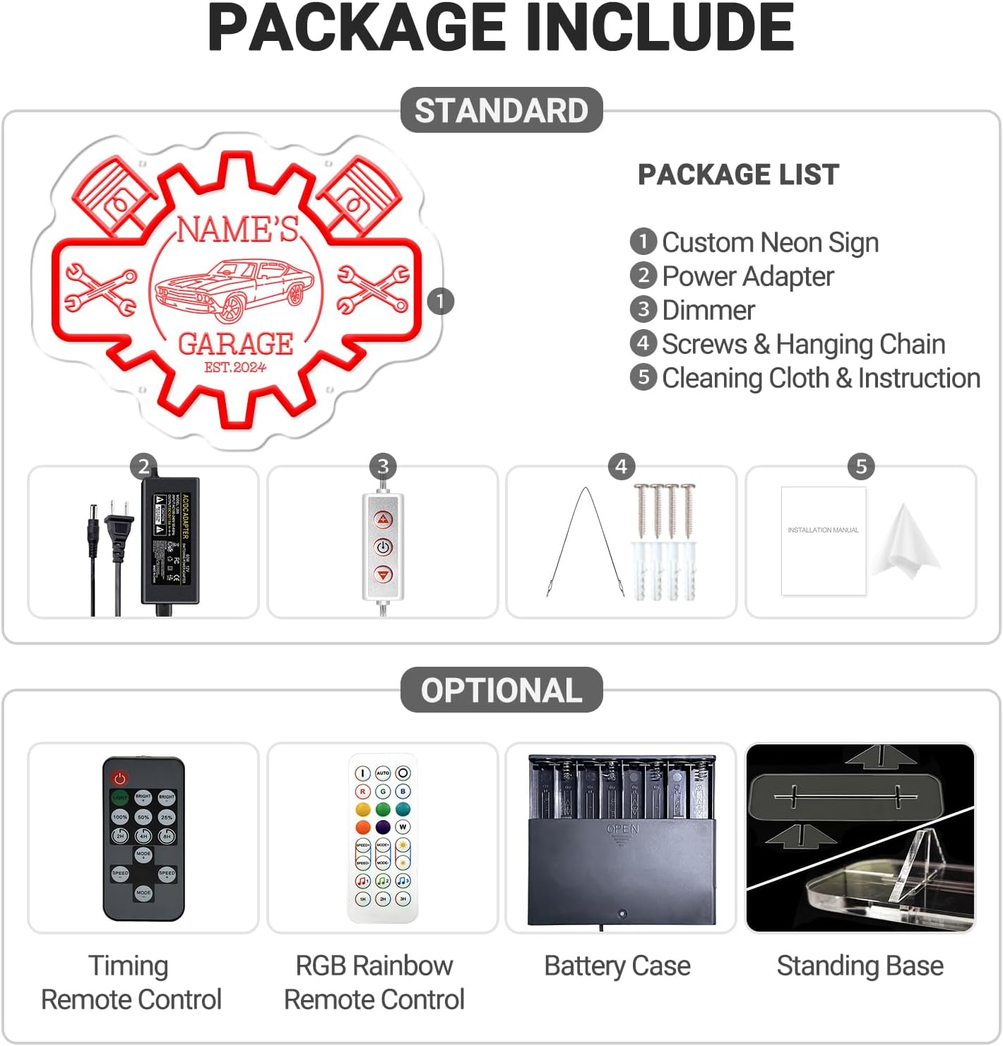 - 【Personalized Garage Signs】The personalized garage neon sign create a romantic, warm and stylish atmosphere for your man cave and garage decor. Choose your favorite size and color, enter your custom text and so on and tailored to your decoration theme to create a truly belong you one-of-a-kind led sign. Click the "Customize Now" button to start!