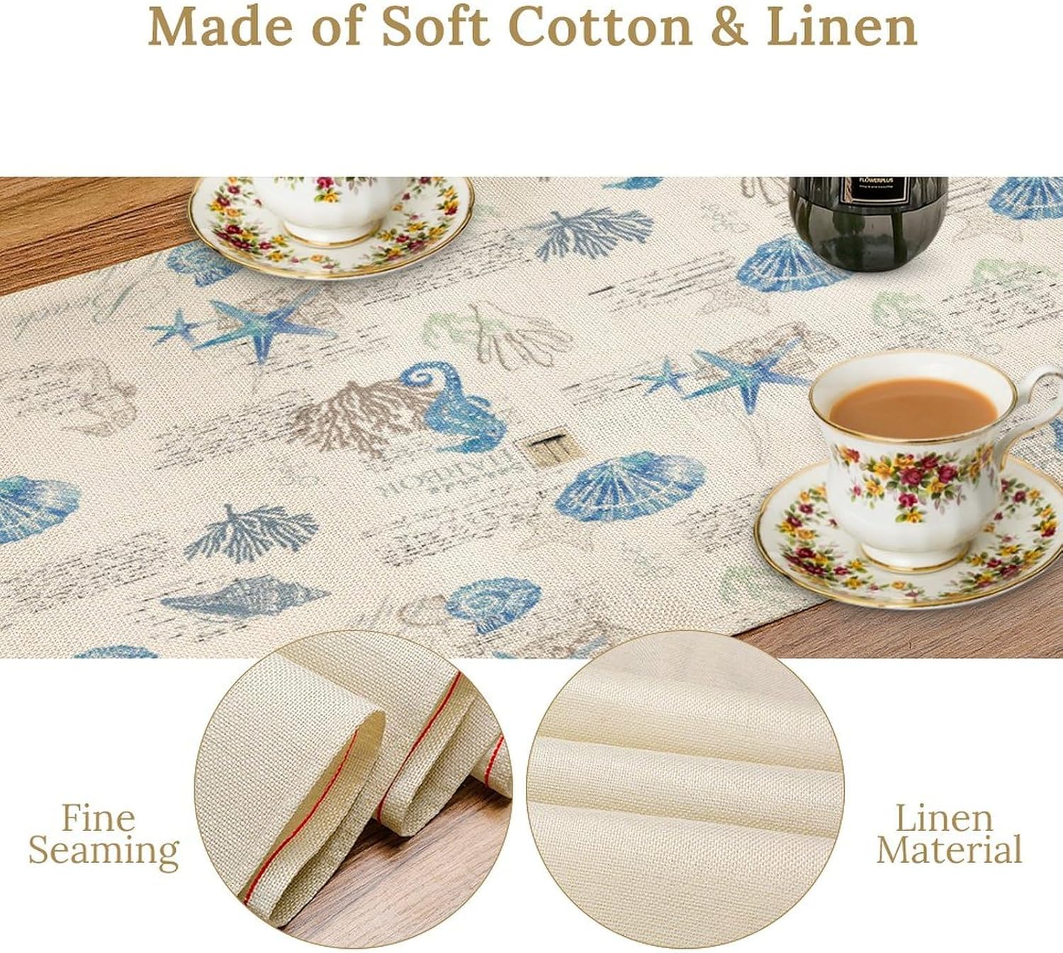 Starfish Table Runner,Vintage Nautical Seashell Tropical Beach Theme Coastal Ocean Sea Burlap for Hotel Indoors Outdoor Dining Room Kitchen Tablecloth, 13x90in