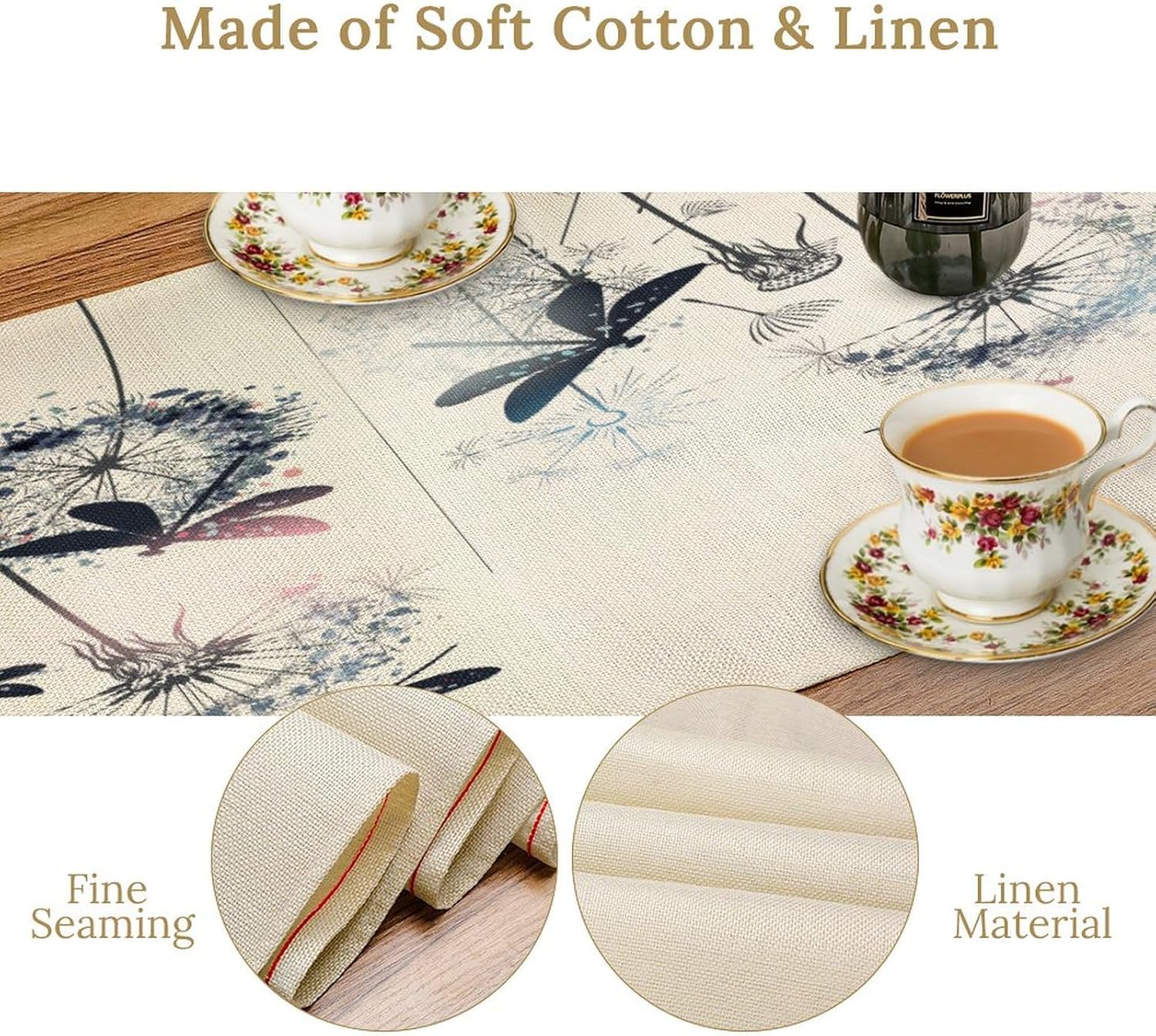 Dandelion Table Runner,Nature Rustic Dragonfly Teal Blue Floral Pattern Print Burlap Tablecloth for Hotel Indoors Outdoor Dining Room Kitchen Table Decor, 13x90in