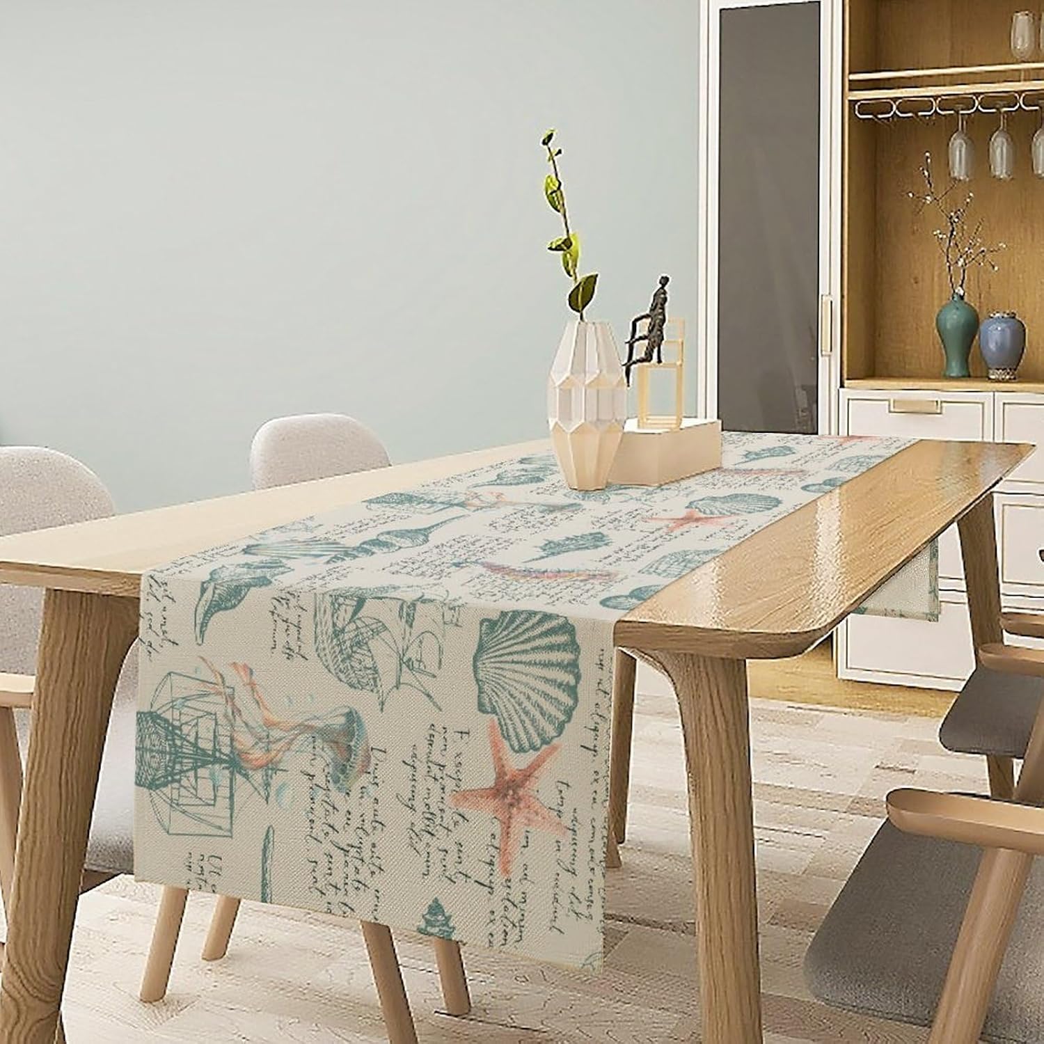 Starfish Table Runner,Seashells Beach Coastal Nautical Sailboat Jellyfish Vintage Hand Drawn Burlap for Hotel Indoors Outdoor Dining Room Kitchen Table Decor, 13x80in