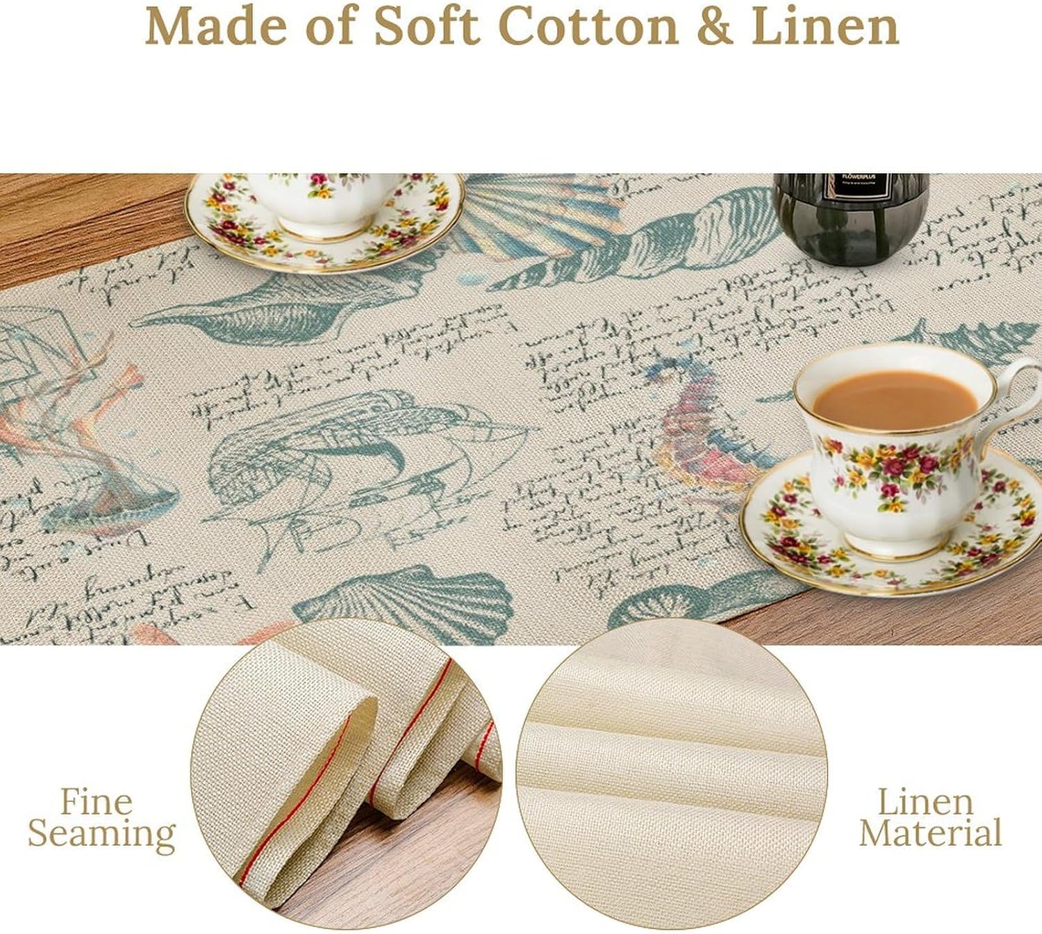 Starfish Table Runner,Seashells Beach Coastal Nautical Sailboat Jellyfish Vintage Hand Drawn Burlap for Hotel Indoors Outdoor Dining Room Kitchen Table Decor, 13x108in