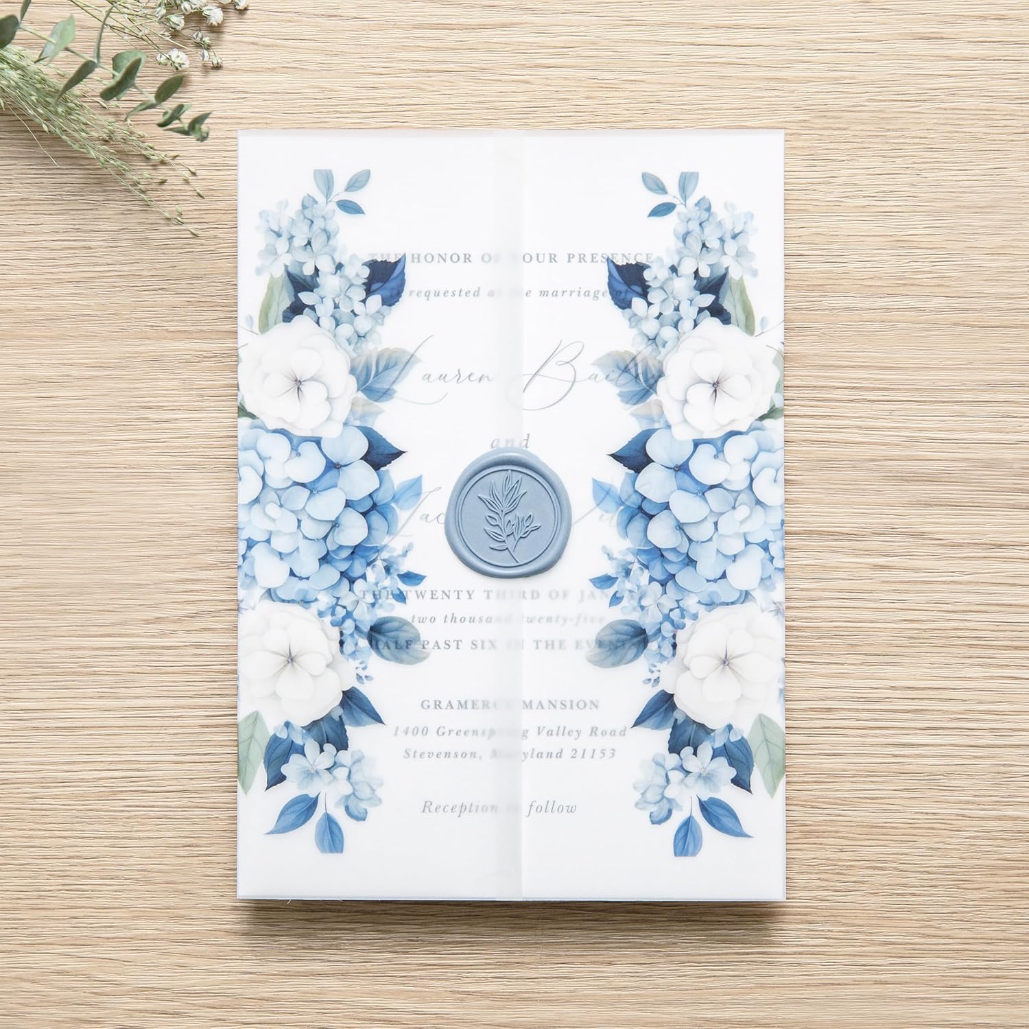 PONATIA 50PCS Vellum Jackets for 5x7 Invitation Cards- 135GSM Dusty Blue Flowers Sleeves, Vellum Paper 5x7 Jackets - Wedding Invitations Wraps - Transparent Card