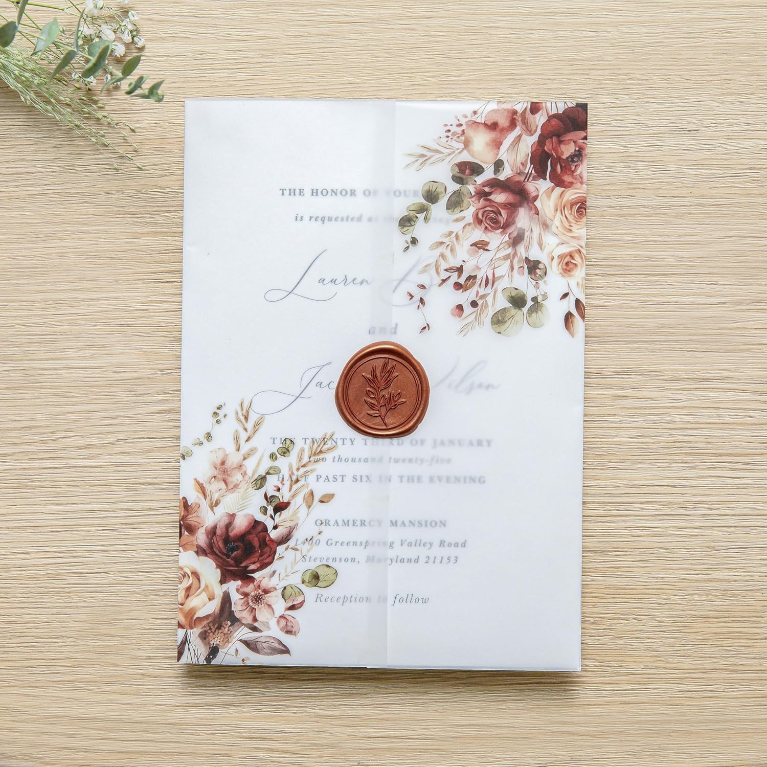 PONATIA 50PCS Vellum Jackets for 5x7 Invitation Cards- 135GSM Burnt Orange Floral Printed Vellum Sleeves, Quinceanera Wedding Invitation Cards Wraps, Transparent Christmas Gift Cards Jackets