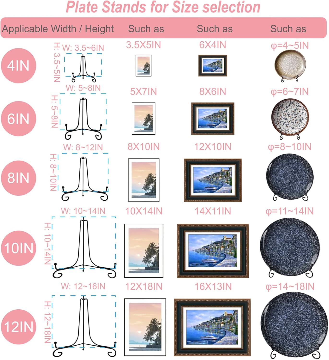 - Choose The Right Size: 8 Inch plate display stands are suitable for items of Rectangle 8 - 12 Inch Height / Wide and Round φ=8 - 10 IN Diameter. Plate holders for displaying are made of solid metal wire and black spray paint resistant to corrosion