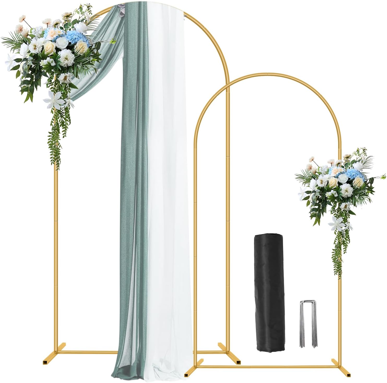- Set of 2 Unique Wedding Arch Stand: Our arch backdrop stand set include Two different size, meeting your different needs.The sizes are 7.2FT and 6FT.Package contains 1 pc 6 Ft gold wedding arch stand, 1pcs 7.2FT wedding arch, 1pc black storage bag, 8 Pcs U-Shaped Garden Stakes and 2 Pcs 5M Balloon arch strip