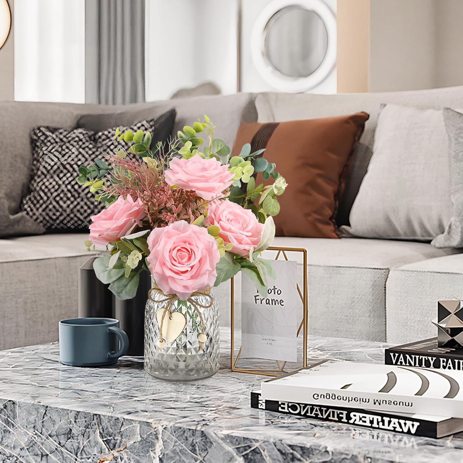 - Artificial Flowers in Vase: This exquisite flower arrangement includes silk roses, artificial eucalyptus, and flocked lamb's ear arranged in a beautifully designed glass vase adorned with heart-shaped and globe pendants, finished with rustic twine. Perfect for any home or office, this combination adds a natural charm to your space, ideal for coffee table centerpieces, dining room decor, or farmhouse-style home accents.