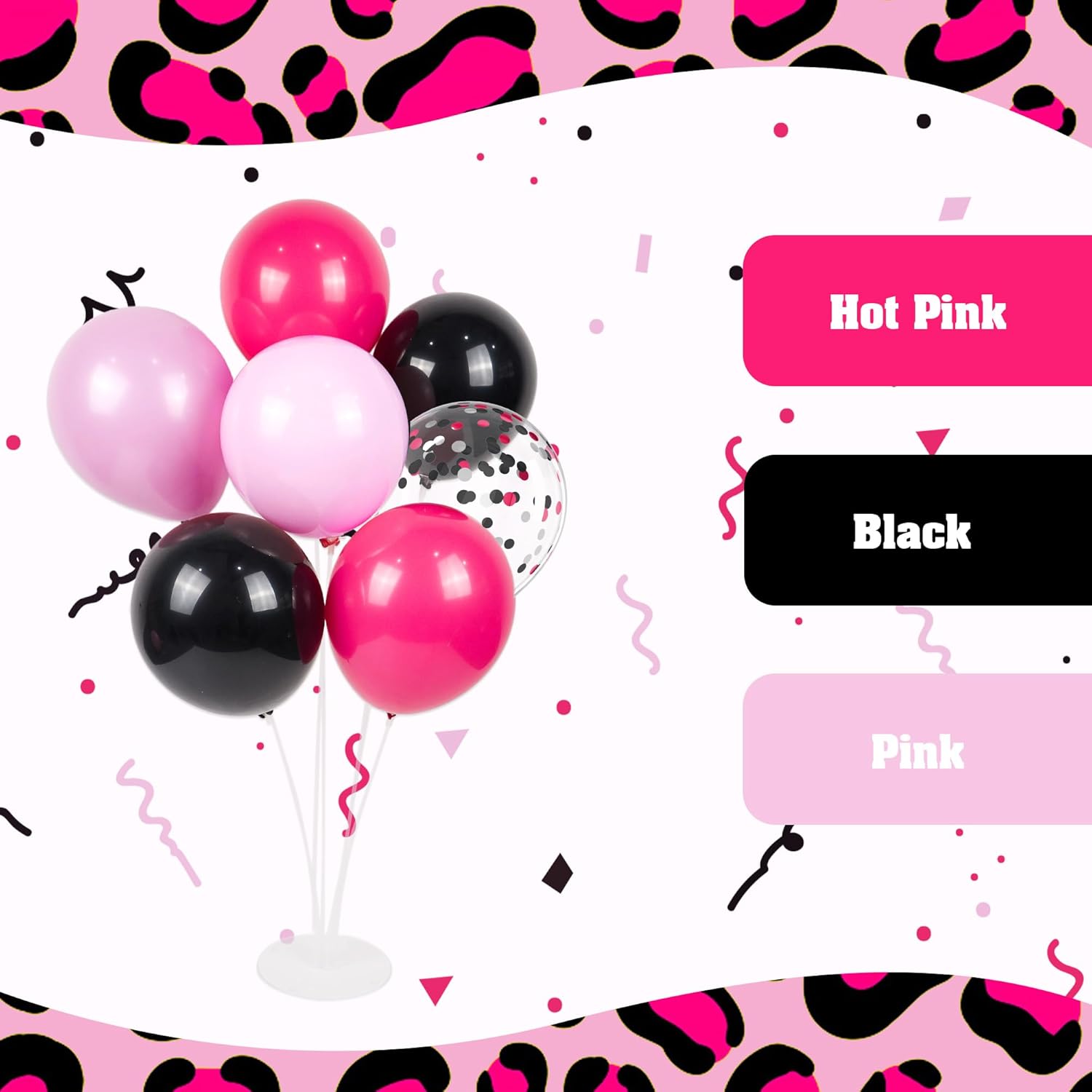- Package Include: The pink and black balloons include 12inch hot pink balloonsx15, 12inch light pink balloonsx10, 12inch pastel pink balloonsx10, 12inch black balloonsx15, 12inch pink black silver confetti balloonsx10, pink ribbonx1, glue dotsx1