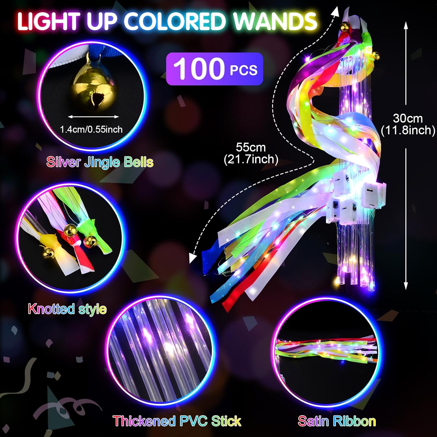 100 PCS Light Up Wands for Wedding, Wedding Favors with 3 Colorful Flashing Modes, LED Silk Fairy Wands with Bells for Wedding, New Year, Raves, Concert, Birthday, Party Streamers