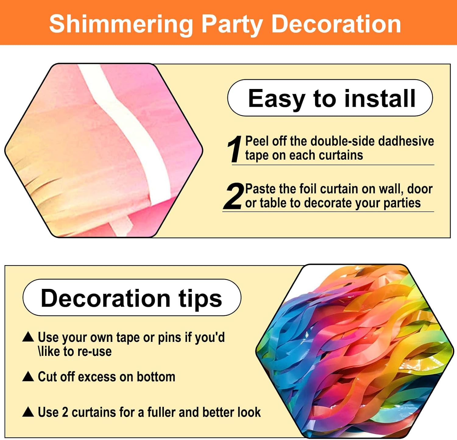- Easy To Assemble | Strong Adhesive | Not Easy Fade : The foil fringe curtain backdrop party decorations come with double-sided adhesive tape, easy to use, just tear off the back of adhesive tape, then paste this streamers backdrop curtains on the top of wall, window, table, or as door fringe decoration.