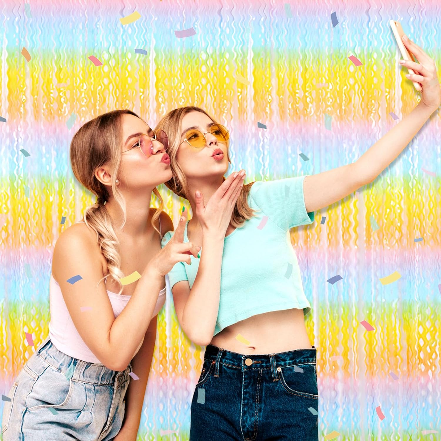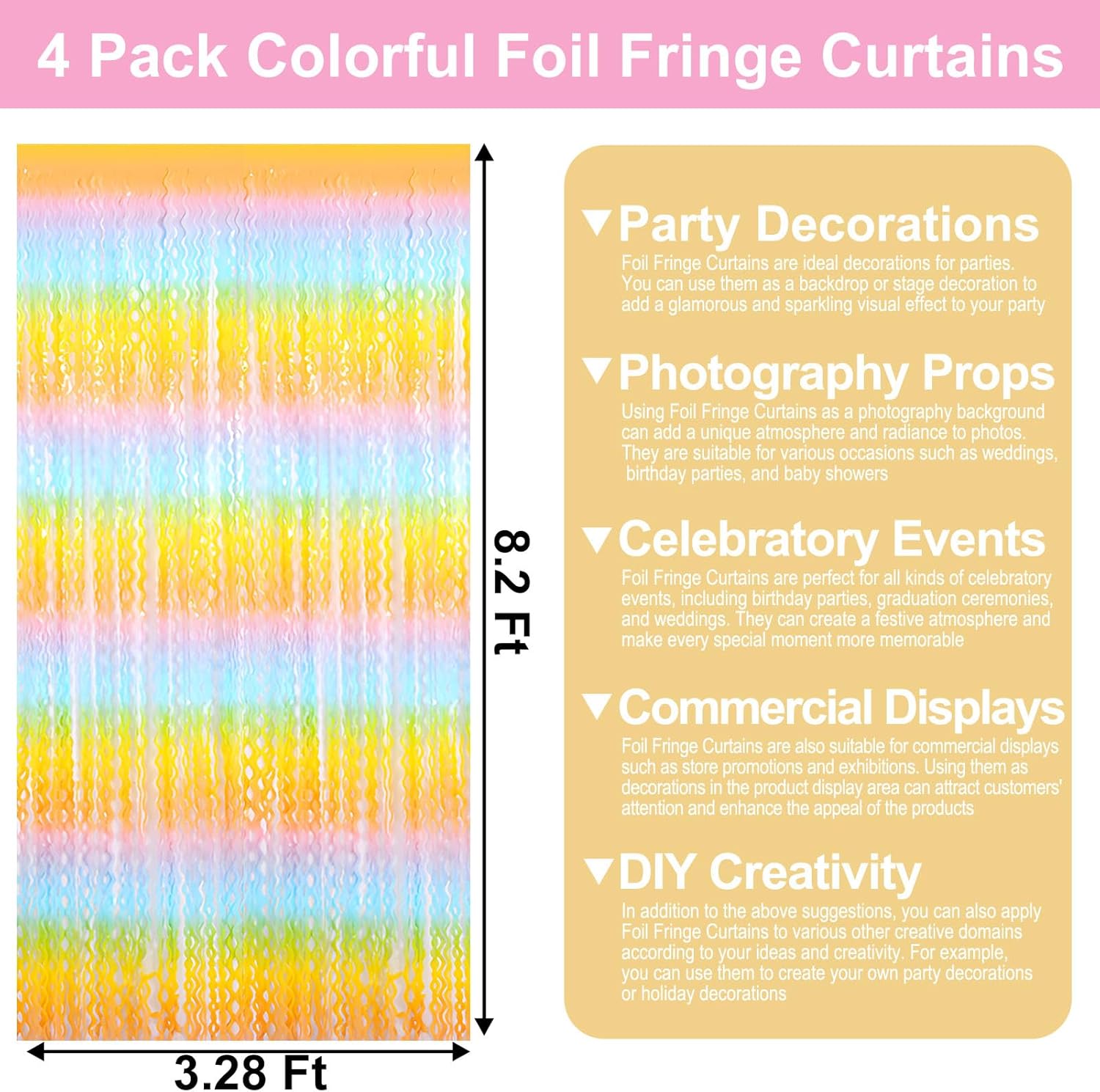 4 Pack Light Rainbow Wave Foil Fringe Curtain Backdrop, 3.28Ft x 8.2Ft Metallic Tinsel Foil Fringe Streamer Curtains for Photo Booth, Mother's Day, Easter, Birthday, Wedding Party Decoration