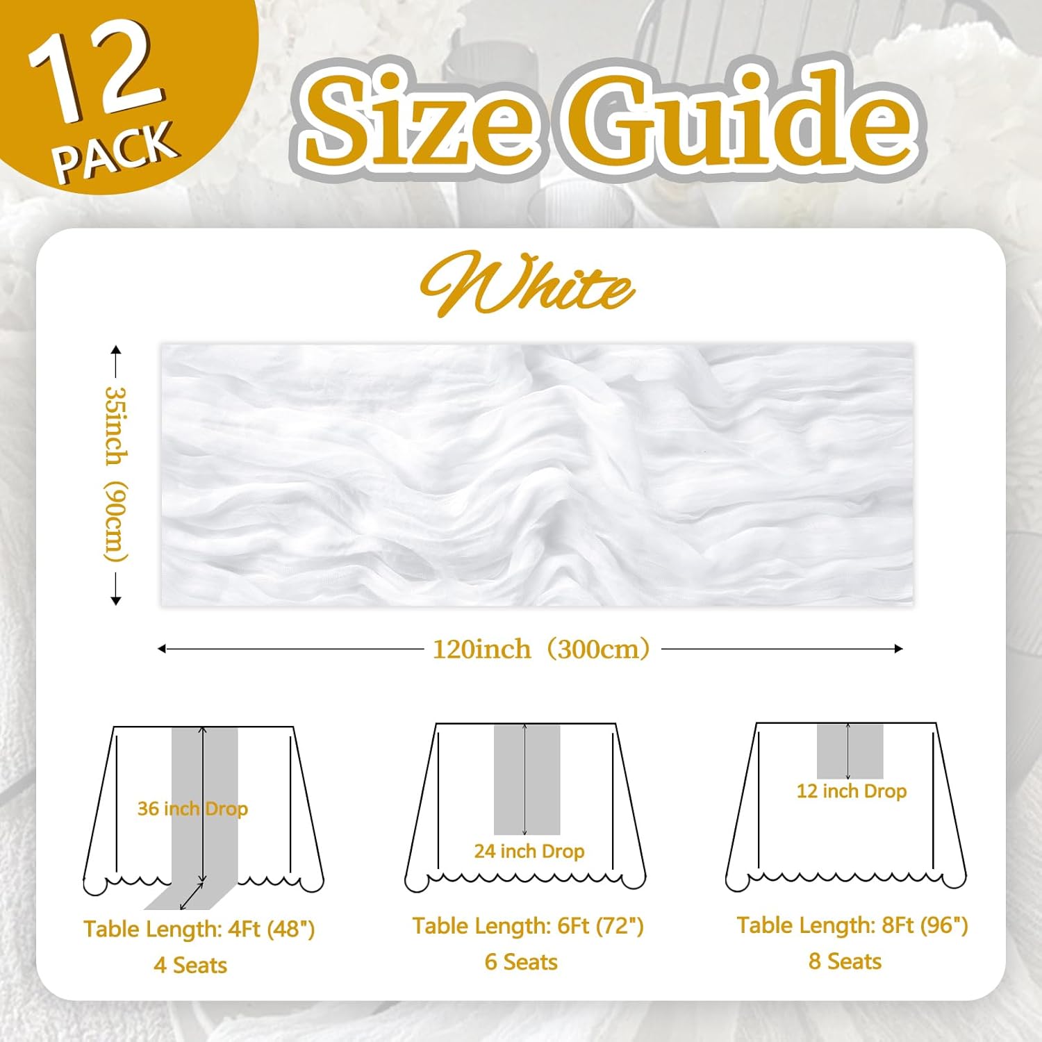 - 【Package Included】You Will Be Delighted To Receive 12 Pack Of White Table Runner. The White Cheesecloth Table Runner Quantity Is Abundant, Fully Meeting Your Daily Use And Various Event Needs. The Size Of The Table Runners Is 35 x 120 Inch, Which Can Perfectly Fit Tables Or Chairs In Various Event Scenarios. Besides, We Have Carefully Prepared A Wide Range Of Color Options For You, Which Are Highly Suitable For Creating A Romantic And Extraordinary Atmosphere.
