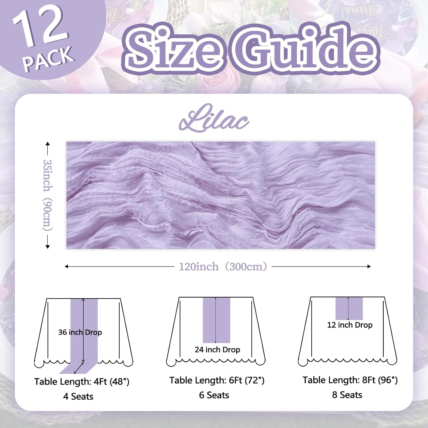 - 【Package Included】You Will Be Delighted To Receive 12 Pack Of Lilac Purple Table Runner. The Lilac Purple Cheesecloth Table Runner Quantity Is Abundant, Fully Meeting Your Daily Use And Various Event Needs. The Size Of The Table Runners Is 35 x 120 Inch, Which Can Perfectly Fit Tables Or Chairs In Various Event Scenarios. Besides, We Have Carefully Prepared A Wide Range Of Color Options For You, Which Are Highly Suitable For Creating A Romantic And Extraordinary Atmosphere.