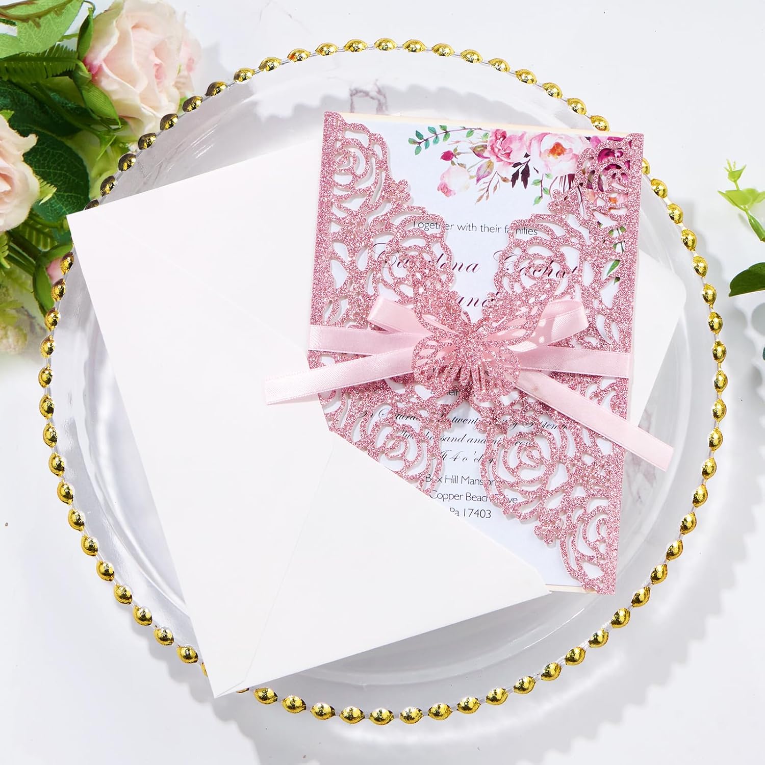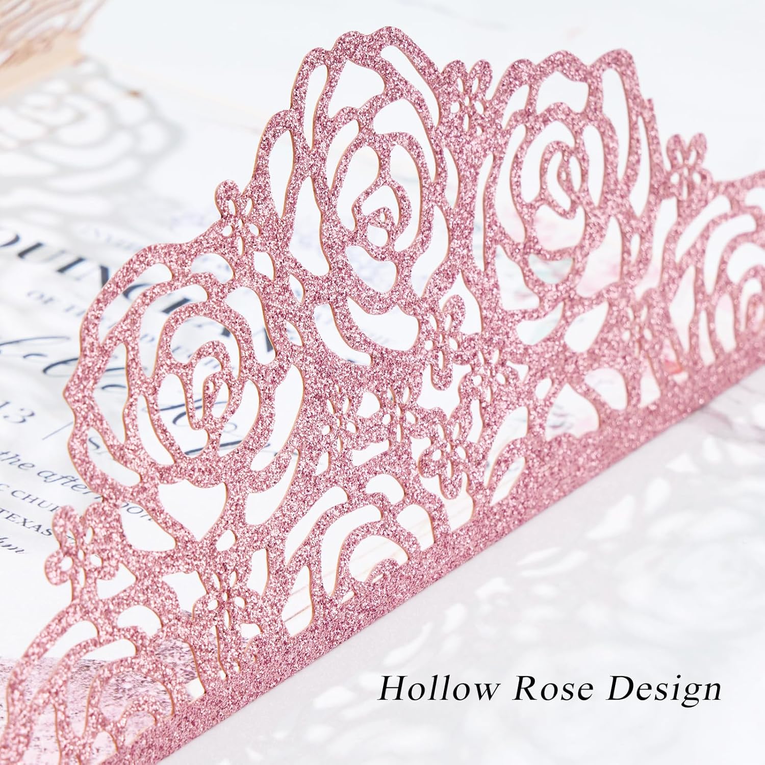 - Glitter Pink Wedding Invitations Personalized :High-quality laser cutting technology, glitter invitations brings high-quality experience,clear printing and neat layout for the 250GSM pearl paper insert, spice up your party.