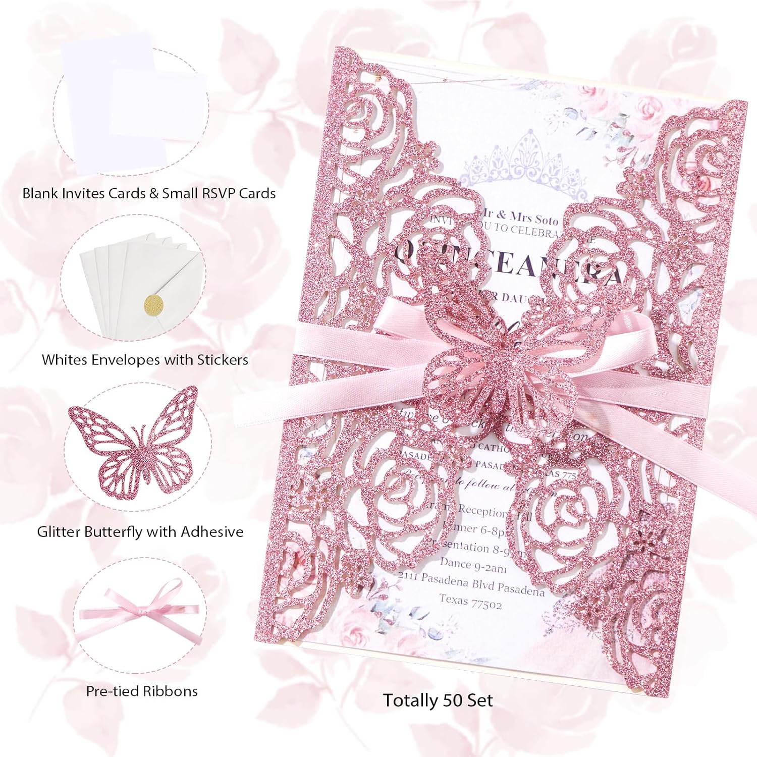 - Wedding Invitation Accessories: 50 pink wedding invitations pocket, 50 blank wedding invitation paper, 50 blank rsvp card, 50 ribbons, 50 white envelopes and seal, 50 butterflies with glues.