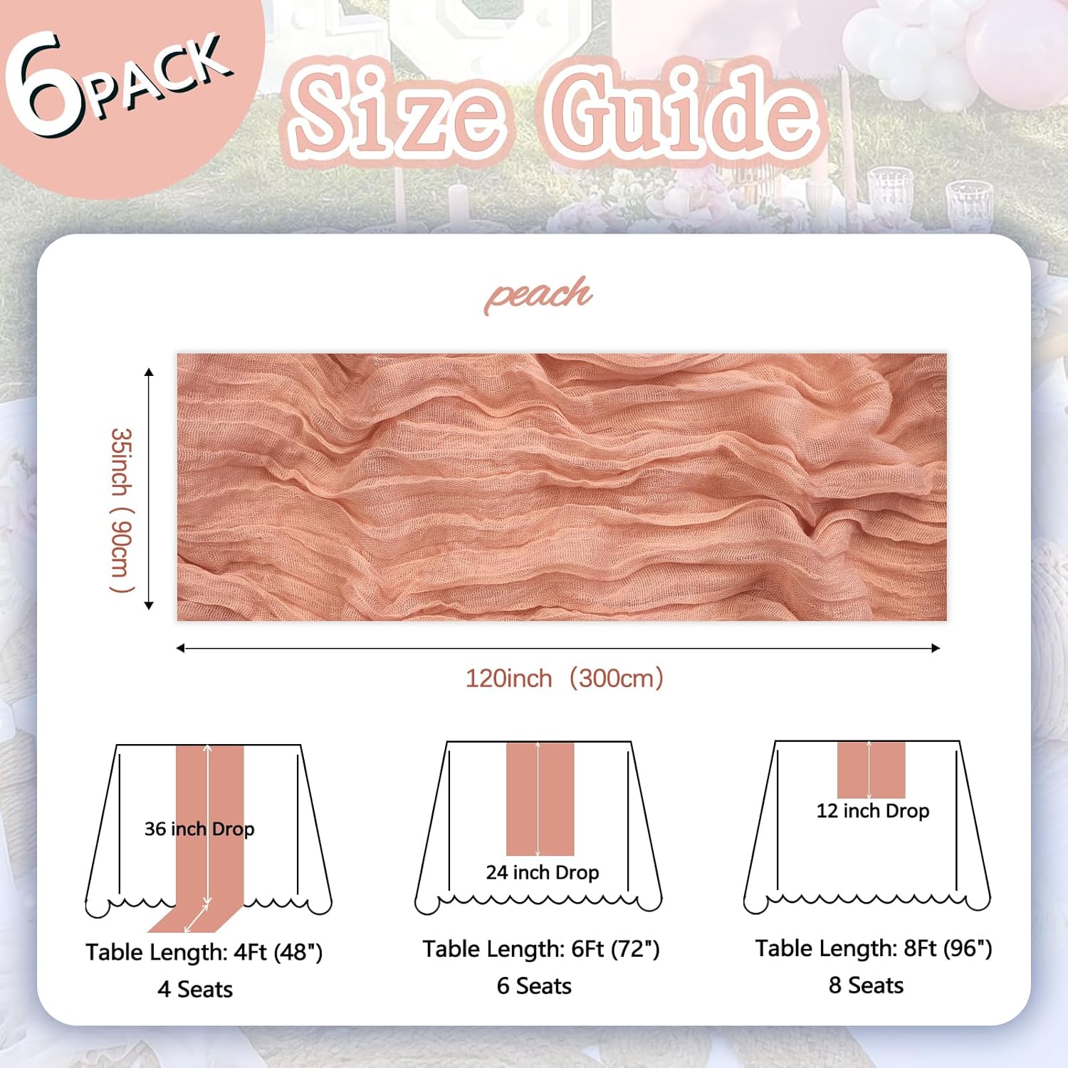 - 【Package Included】You Will Be Delighted To Receive 6 Packs Of Peach Table Runner. The Peach Cheesecloth Table Runner Quantity Is Abundant, Fully Meeting Your Daily Use And Various Event Needs. The Size Of The Table Runners Is 35 x 120 Inch, Which Can Perfectly Fit Tables Or Chairs In Various Event Scenarios. Besides, We Have Carefully Prepared A Wide Range Of Color Options For You, Which Are Highly Suitable For Creating A Romantic And Extraordinary Atmosphere.
