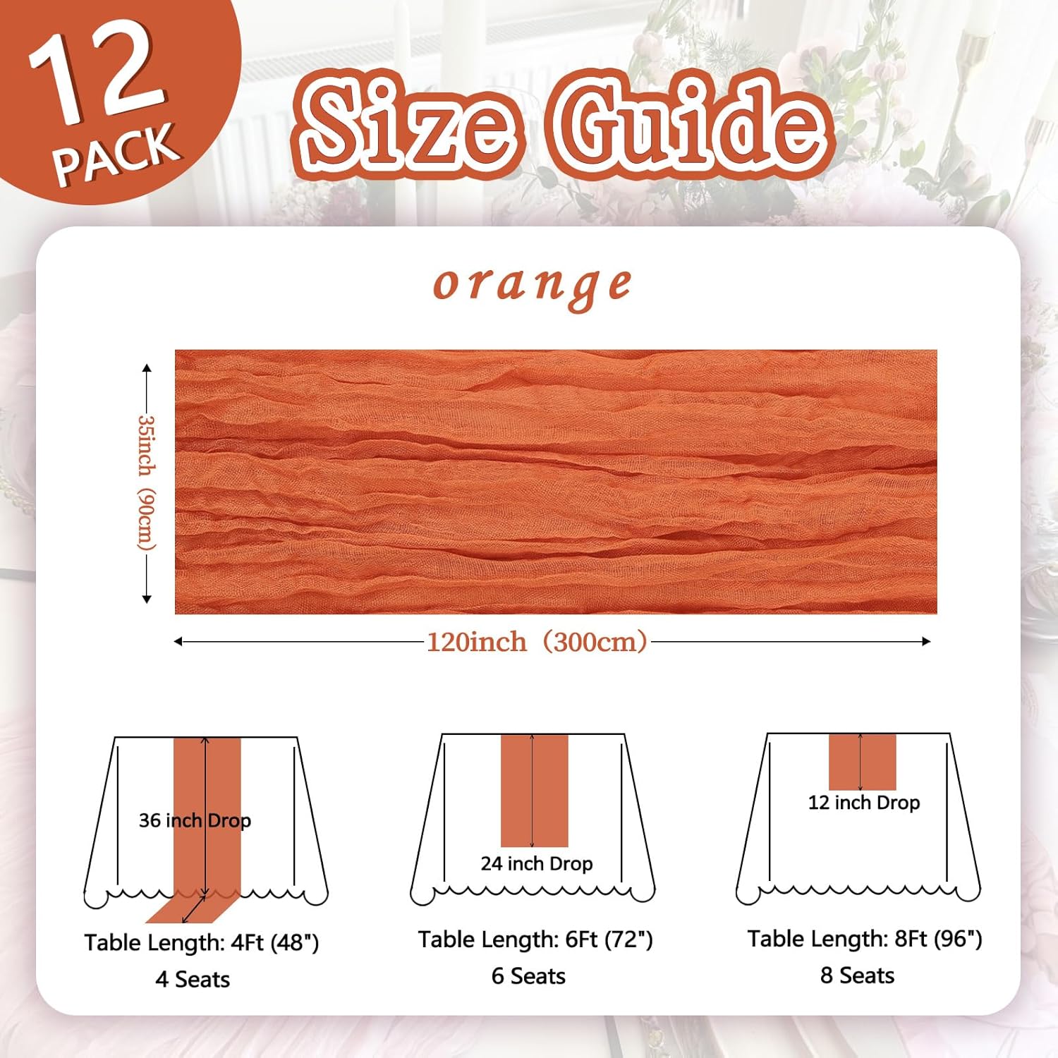 - 【Package Included】You Will Be Delighted To Receive 12 Pack Of Orange Table Runner. The Orange Cheesecloth Table Runner Quantity Is Abundant, Fully Meeting Your Daily Use And Various Event Needs. The Size Of The Table Runners Is 35 x 120 Inch, Which Can Perfectly Fit Tables Or Chairs In Various Event Scenarios. Besides, We Have Carefully Prepared A Wide Range Of Color Options For You, Which Are Highly Suit For Creating A Romantic And Extraordinary Atmosphere.