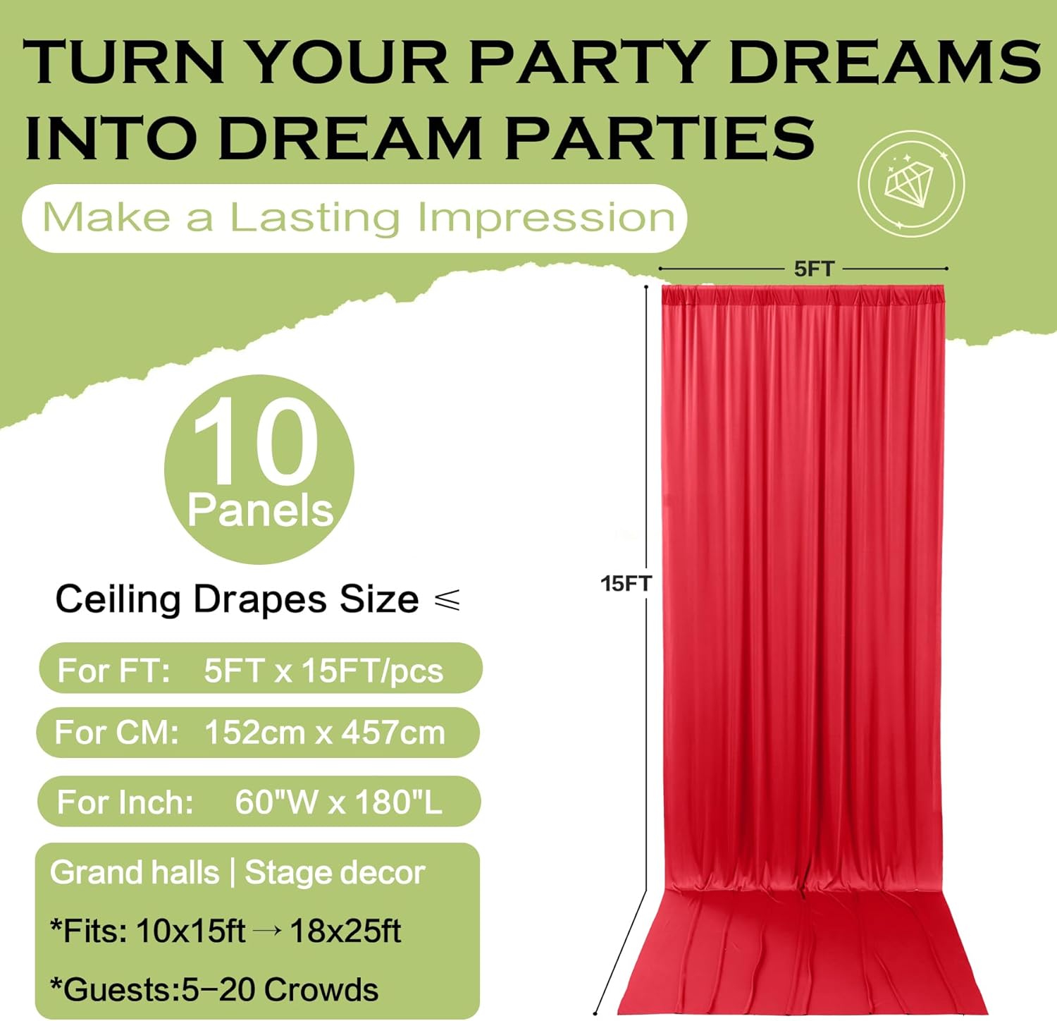 - 15FT Extra Long Backdrop Drapes: 10 Panels 5ftx15ft Red Backdrop Curtains for Parties. Totally 50FT(Width) x 15FT(Height). cortinas para fiestas decoracion.