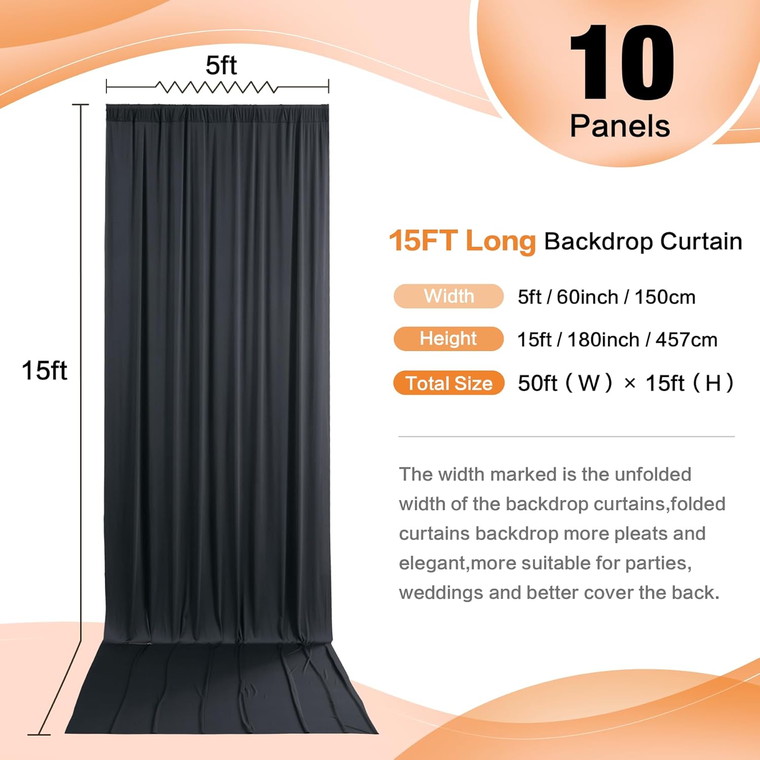 - 15 ft Backdrop Curtain with 10 Panels (50ft x 15ft Total) - Creates unmatched vertical grandeur for wedding drapes, party backdrop demanding attention with the black backdrop curtain 15 ft towering presence that transforms ordinary spaces into breathtaking settings