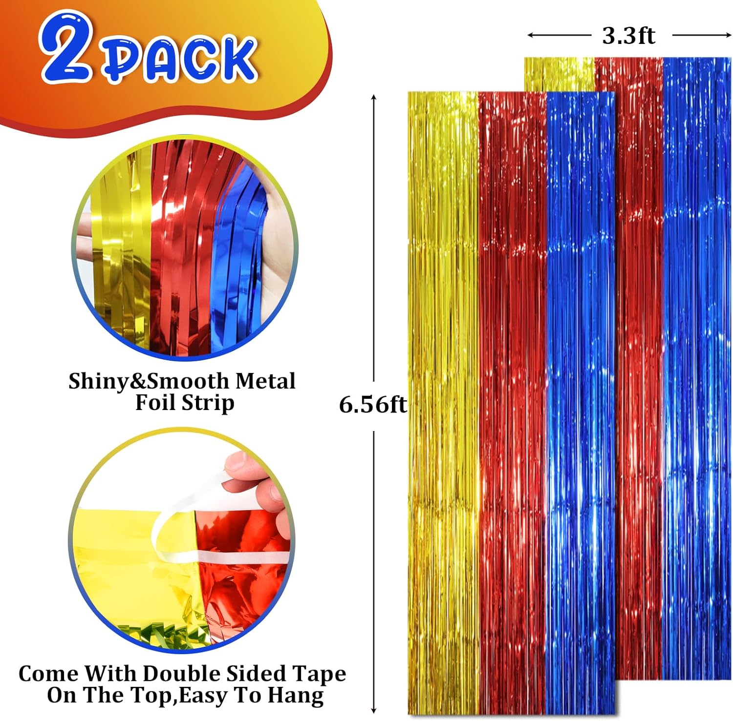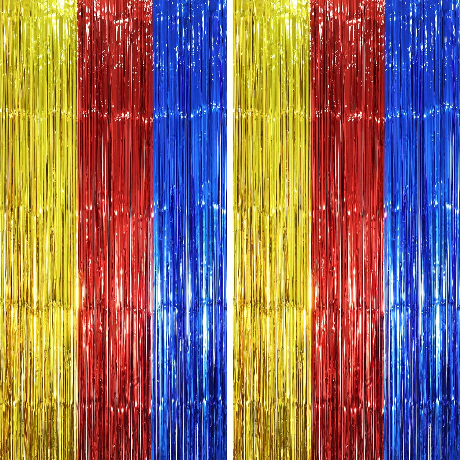 - Stunning Decorative Set: You'll receive 2 pcs blue red and gold foil fringe backdrop curtains, each measuring 3.28 ft (wide)×6.56 ft (drop). Enough length foil fringe curtains backdrops are perfect for the door or wall to create an impressive decoration