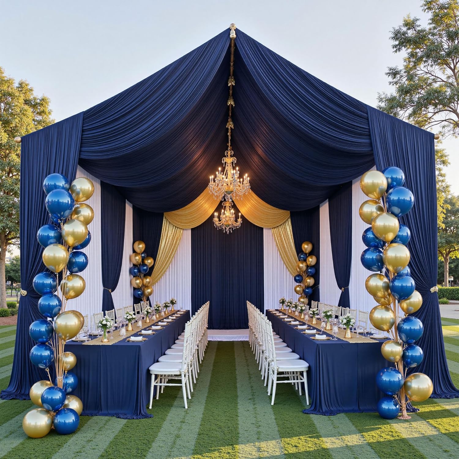PartyVillage 10ftx40ft Navy Blue Ceiling Curtain for Wedding Parties – 2 Panels Wrinkle-Free 40 FT Long Tent Draping Curtains for Wedding, Birthday & Theme Parties, 40ft Height with Rod Pocket