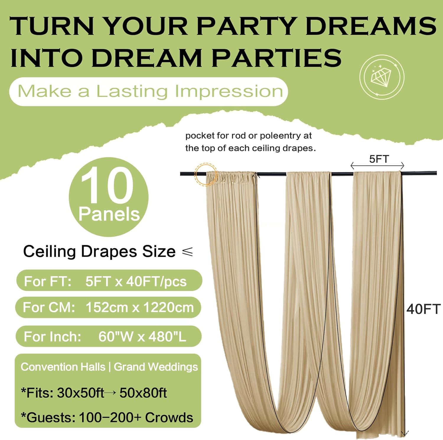 - 40ft Extra Long Ceiling Drapes: 10 Panels 5ftx40ft Beige Backdrop Curtains for Parties. Totally 50FT(Width) x 40FT(Height). cortinas para fiestas decoracion.