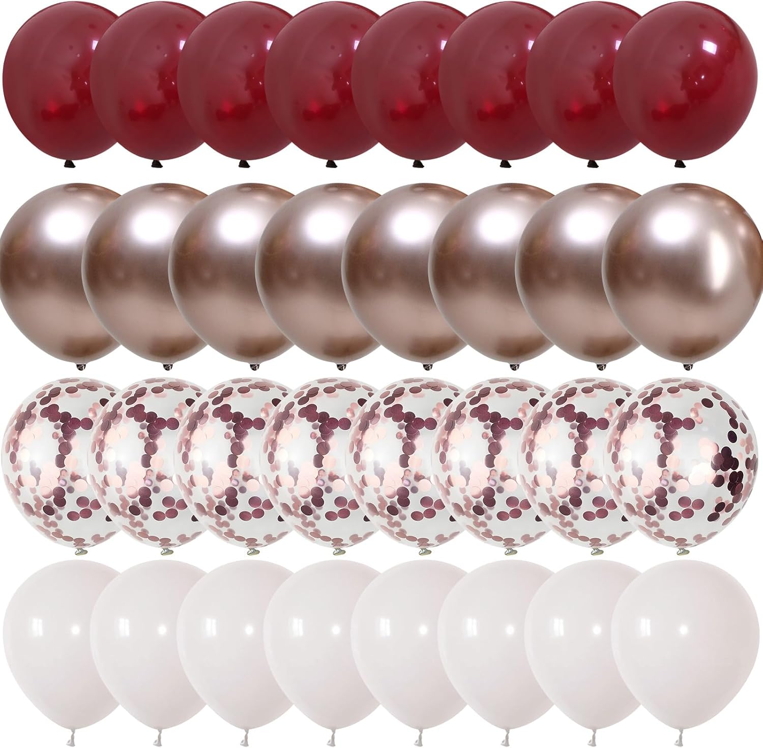 - Party Balloons Set: The burgandy balloons set have 35pcs 12 inch helium balloons, include 12pcs dark red balloons, 8pcs metallic rose gold balloons, 10pcs pearllllll white balloons, 5pcs chrome rose gold confetti balloons, 1pc rose gold balloon ribbon.